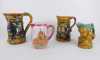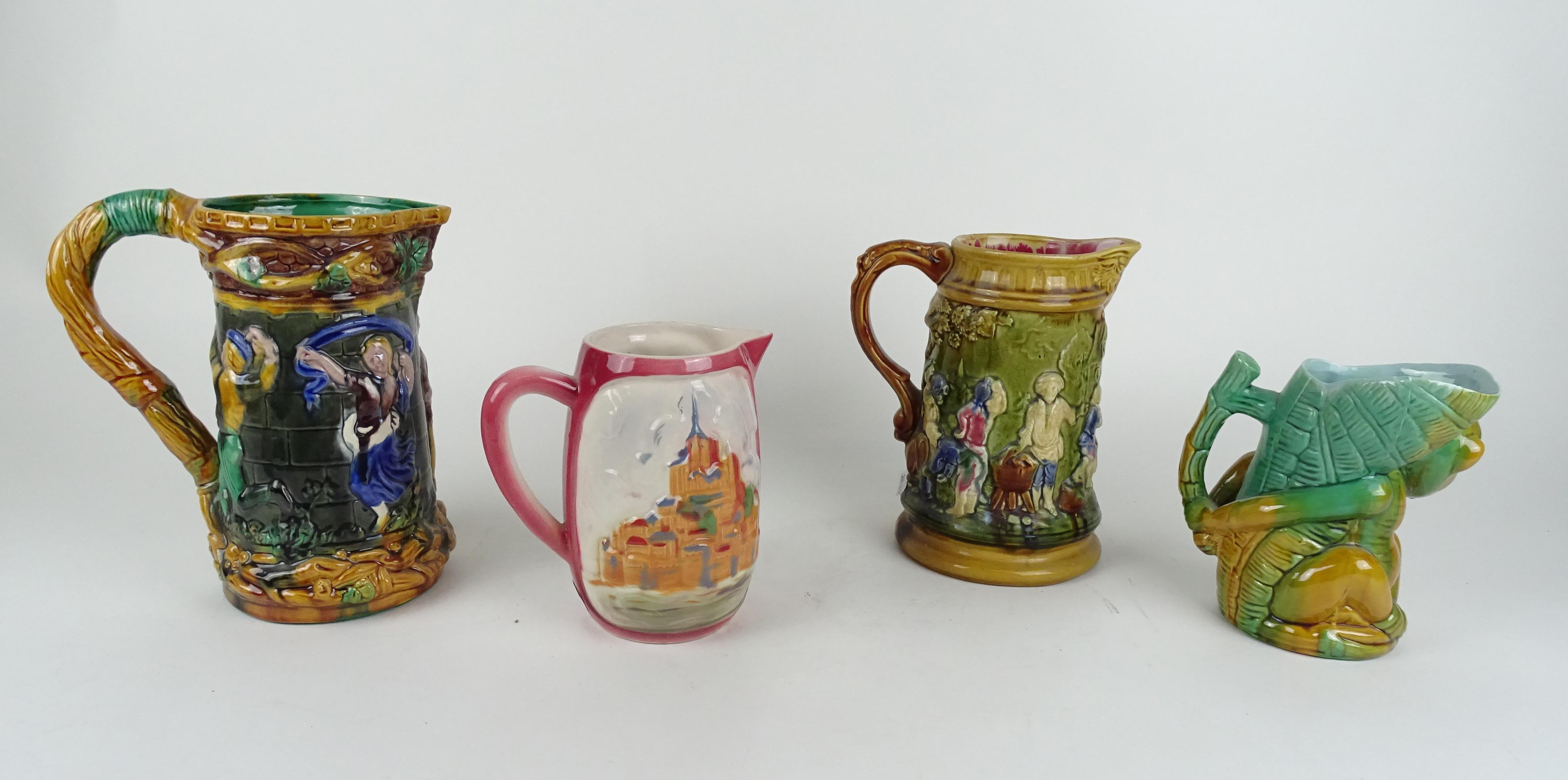 Ceramique: pichet en faience (egr) (4): Singe Staffordshire? H18cm + Saint Clément -Mont St Michel H18cm + attribué à Minton 25cm + nimy? (cheveux) H23cm (4pcs)