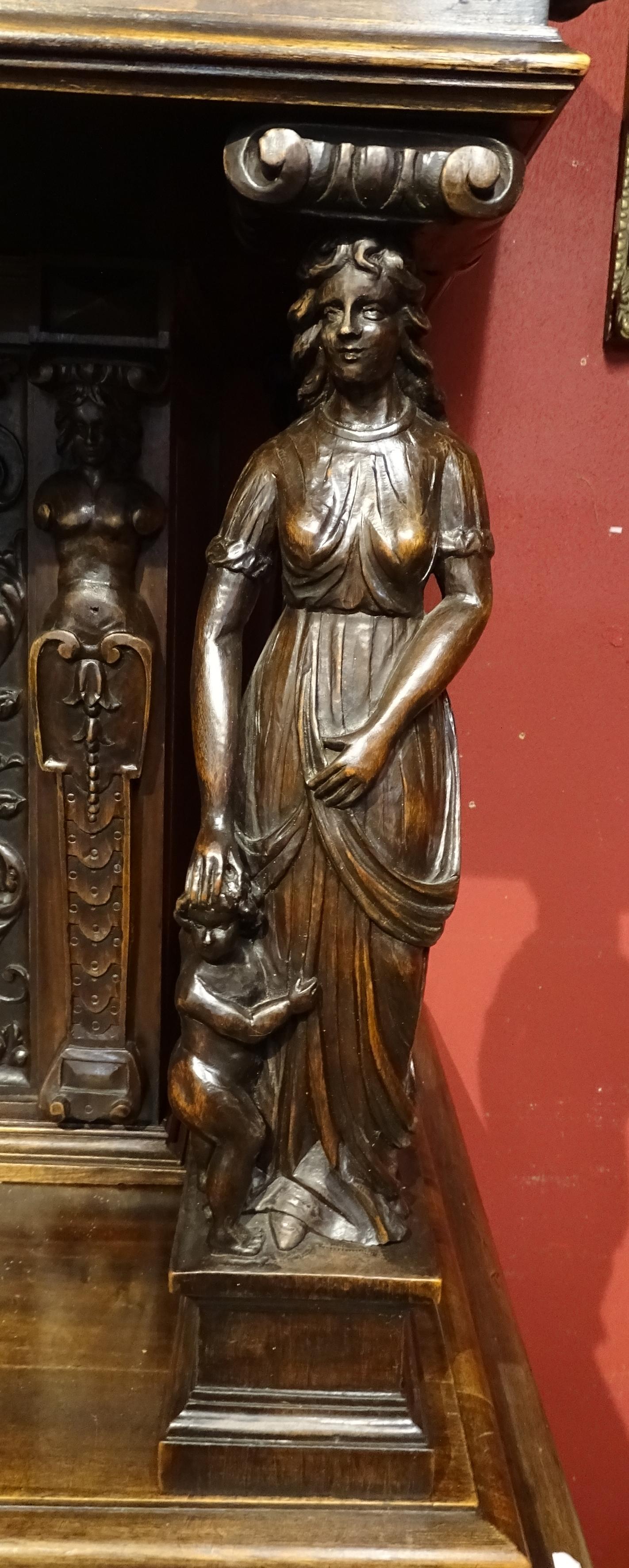 Meuble: Bahut Néo-Renaissance en noyer sculpté 2e moitié 19eS scène galante bas 3P 3T dessus 2 P montants cariatides et colonnes 205x202x70cm
