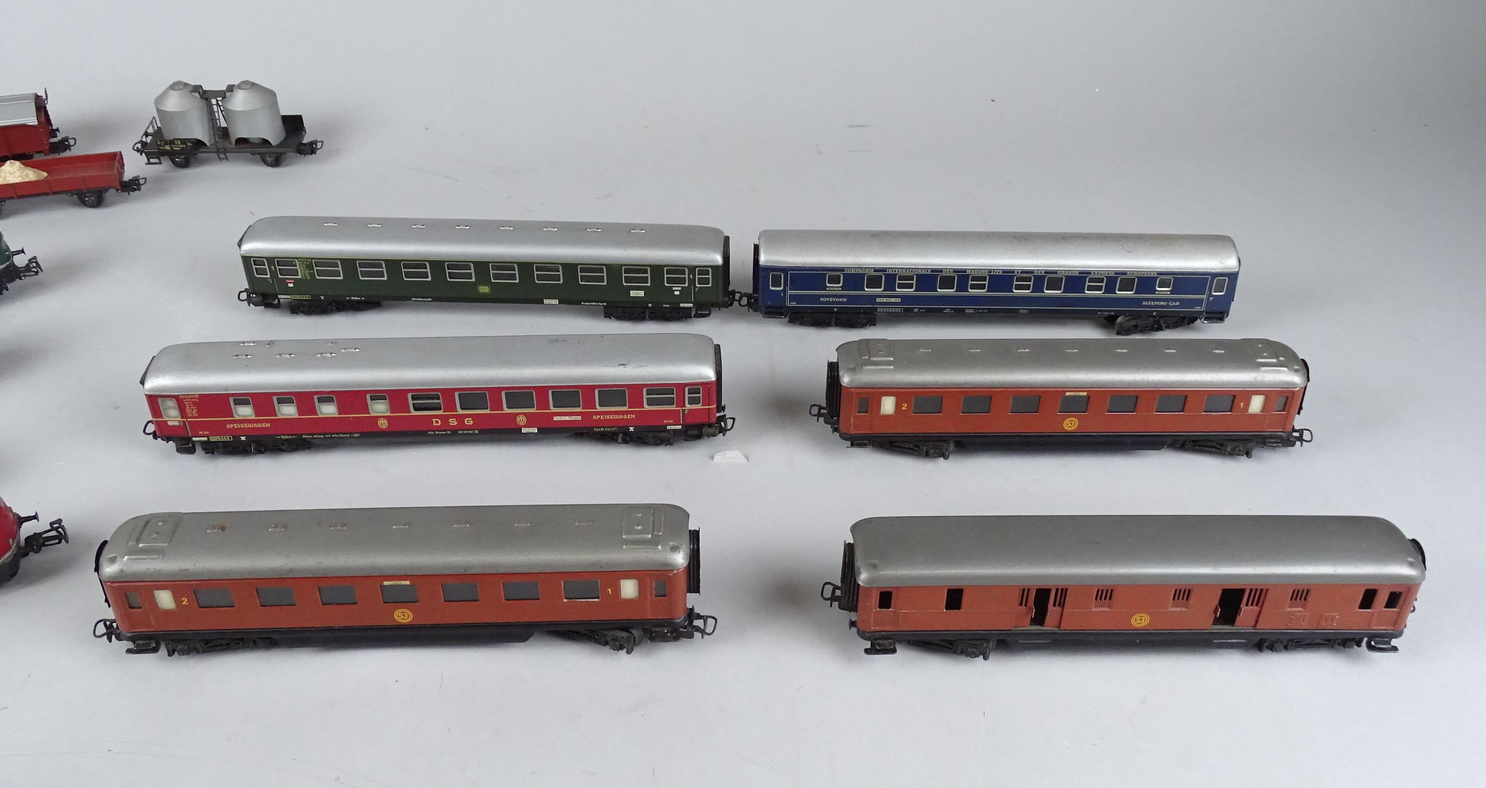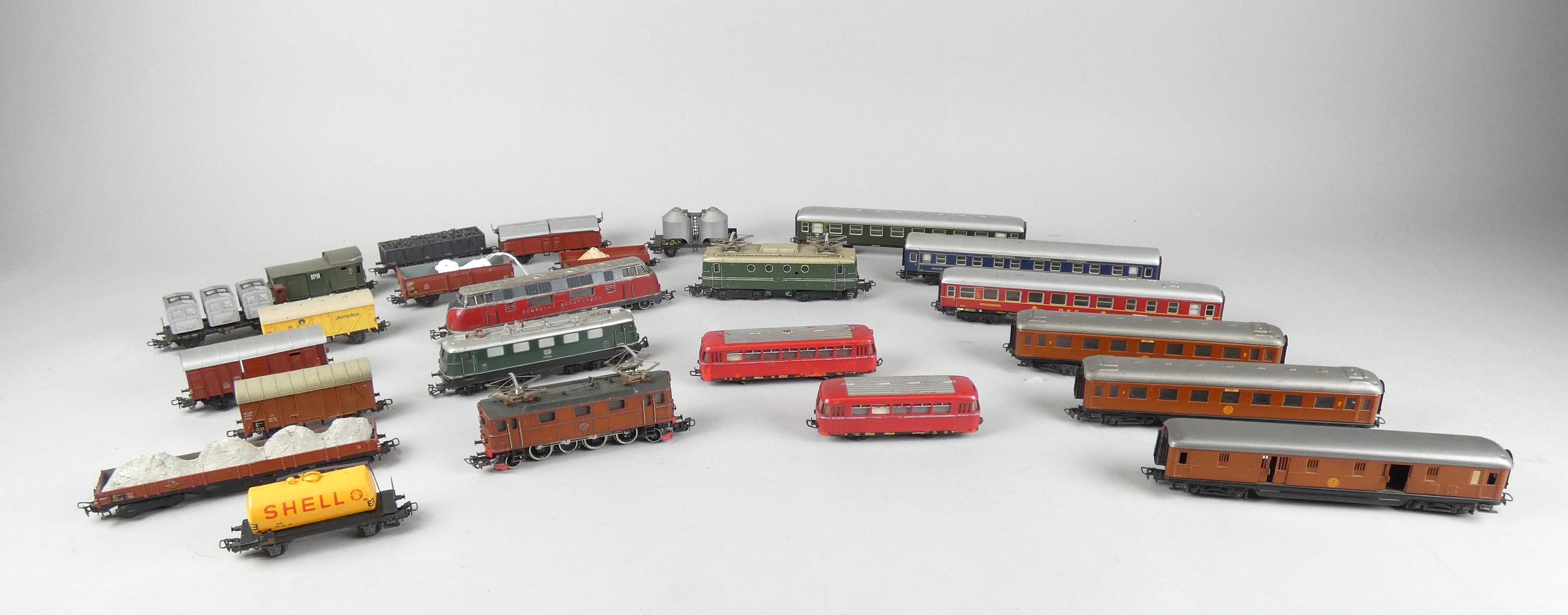 Jouet: Train MARKLIN H0 (traces d'usages): locomotive (5) dont micheline avec wagon, motrice électrique(2) + voitures passagers (6) + wagons(12) (23pcs)