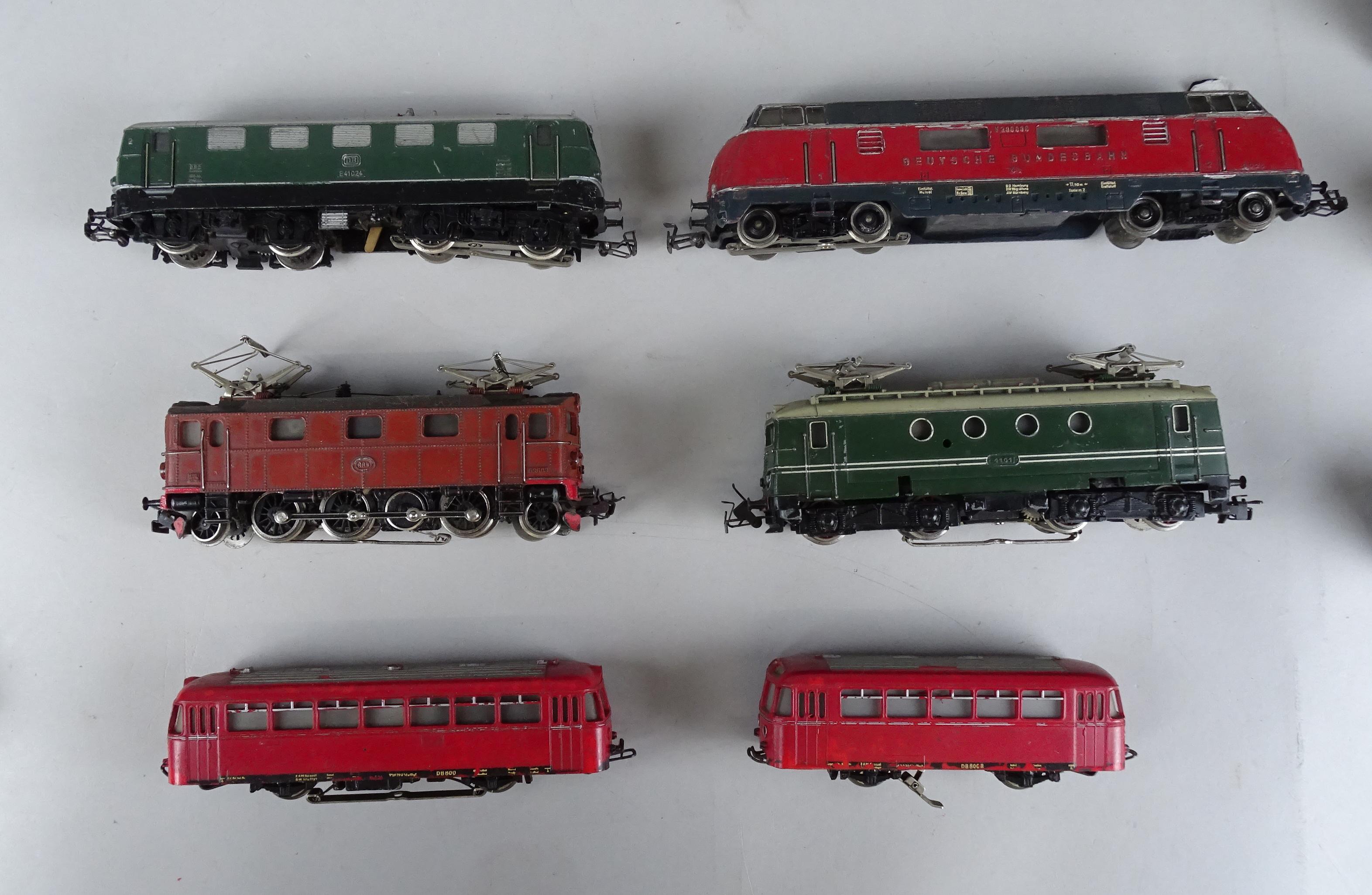 Jouet : Train MARKLIN H0 (traces d'usages) : locomotive (5) dont micheline avec wagon , motrice électrique(2) + voitures passagers (6) + wagons(12)