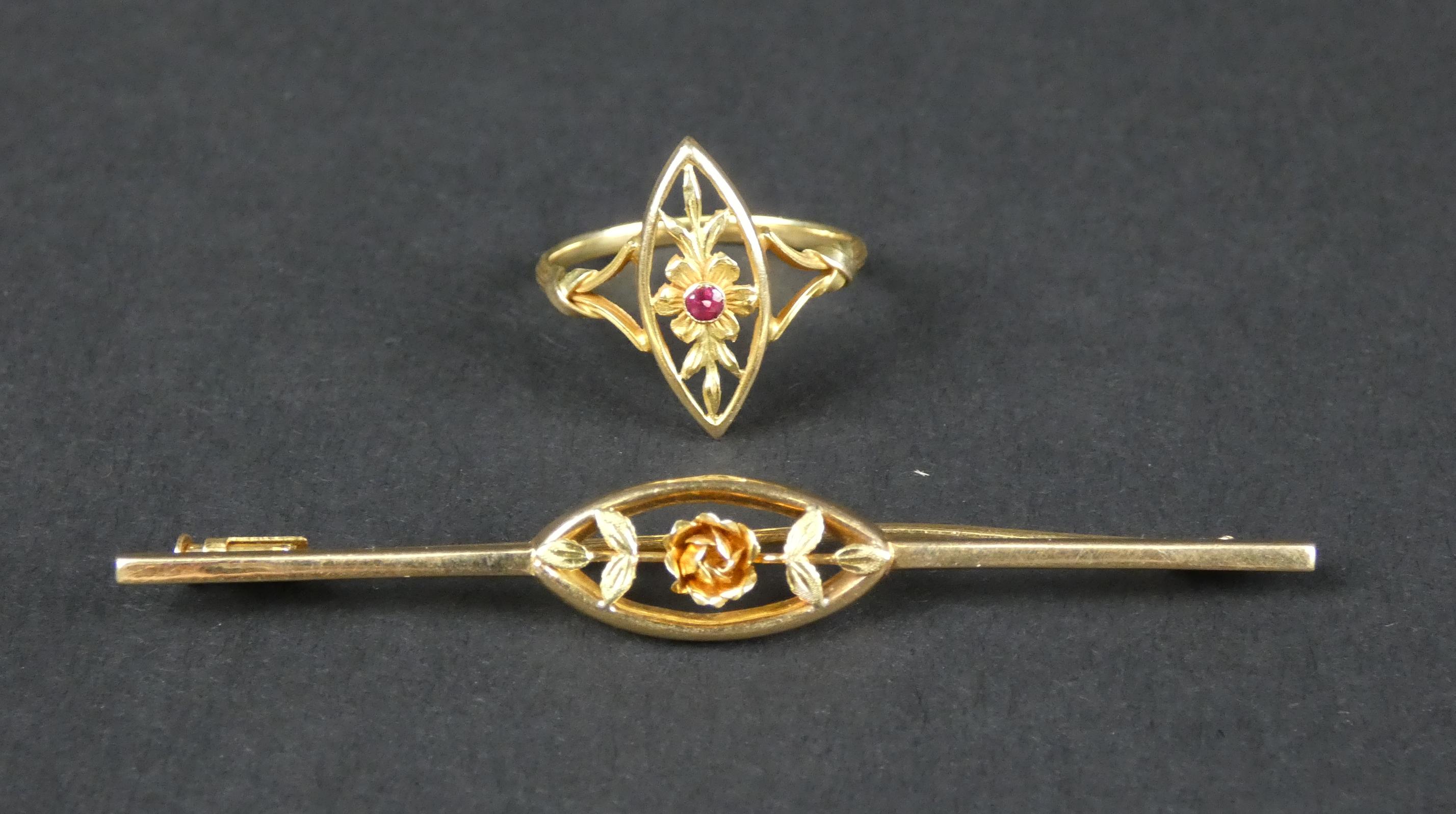 Bijou: Broche et bague en or jaune 18K décor de fleurs P: 4,1g