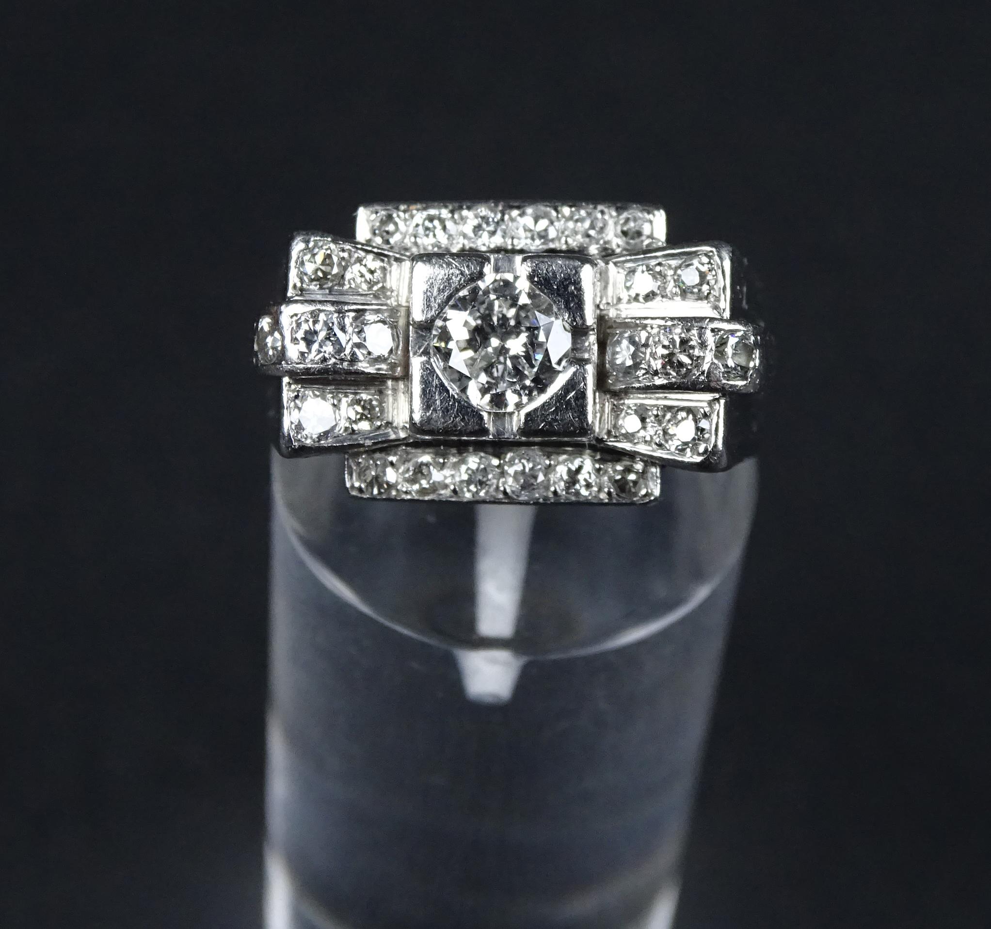Bijou: Bague ART-DECO en platine sertie de 27 diamants dont 1 central d'env. 0,50cts P: 8,4g TDD: 48-49