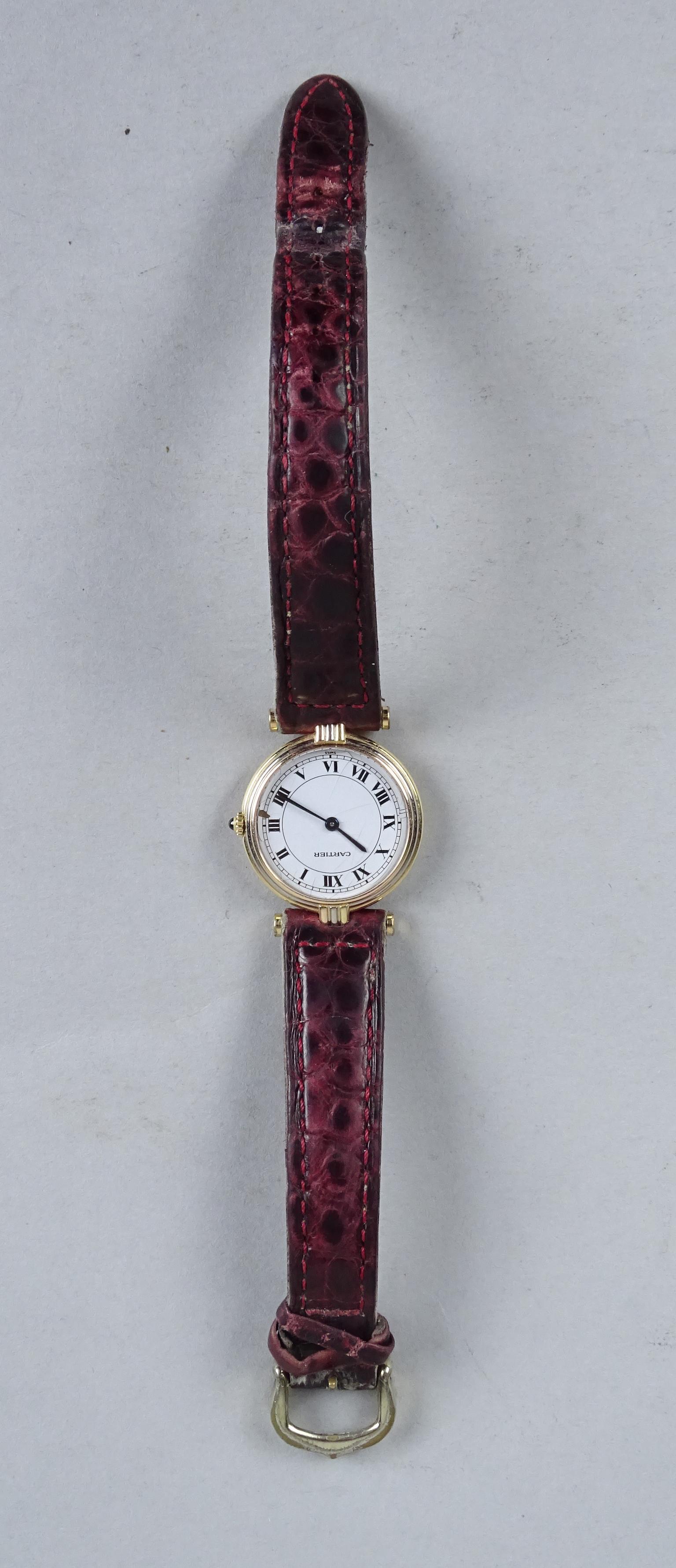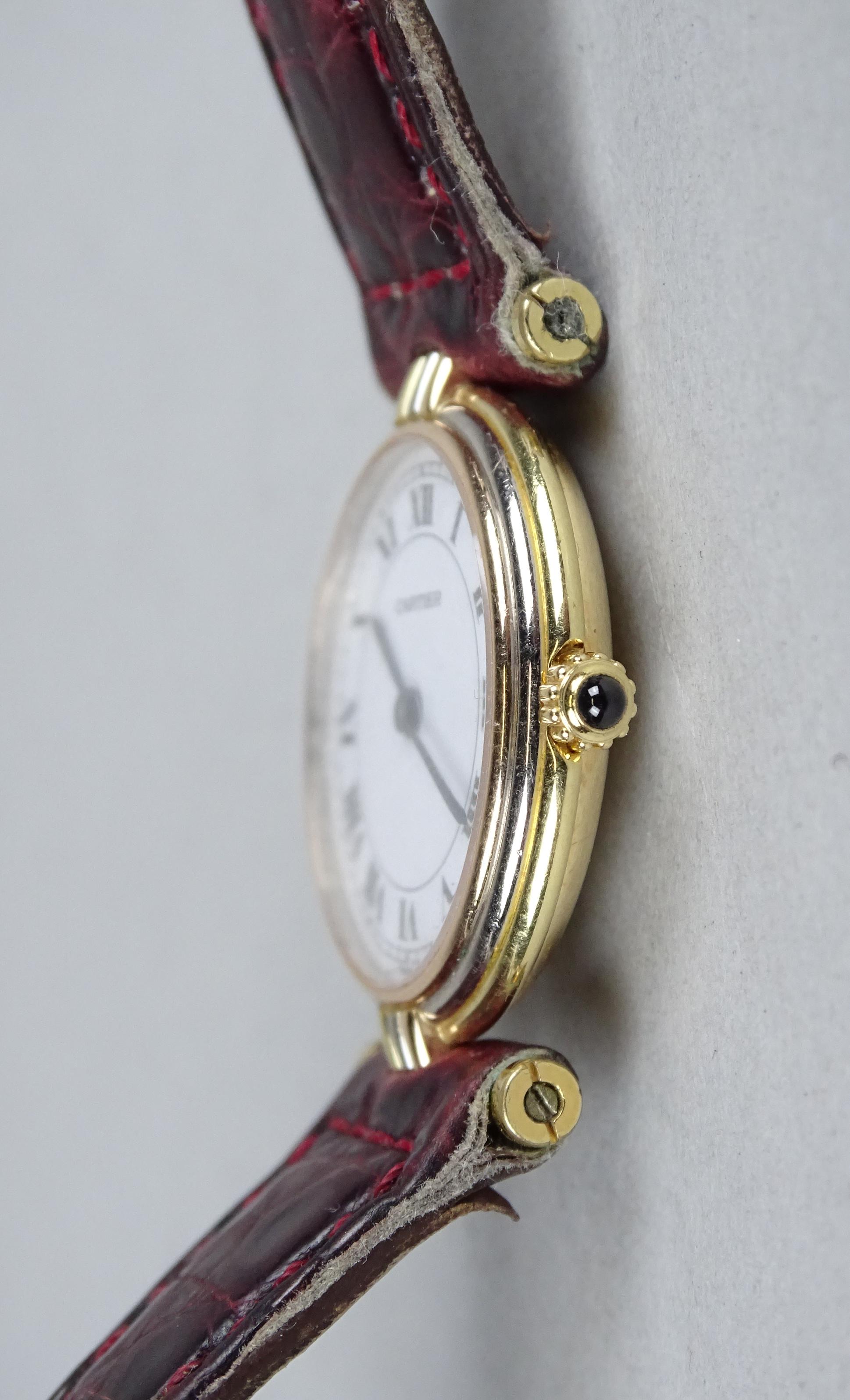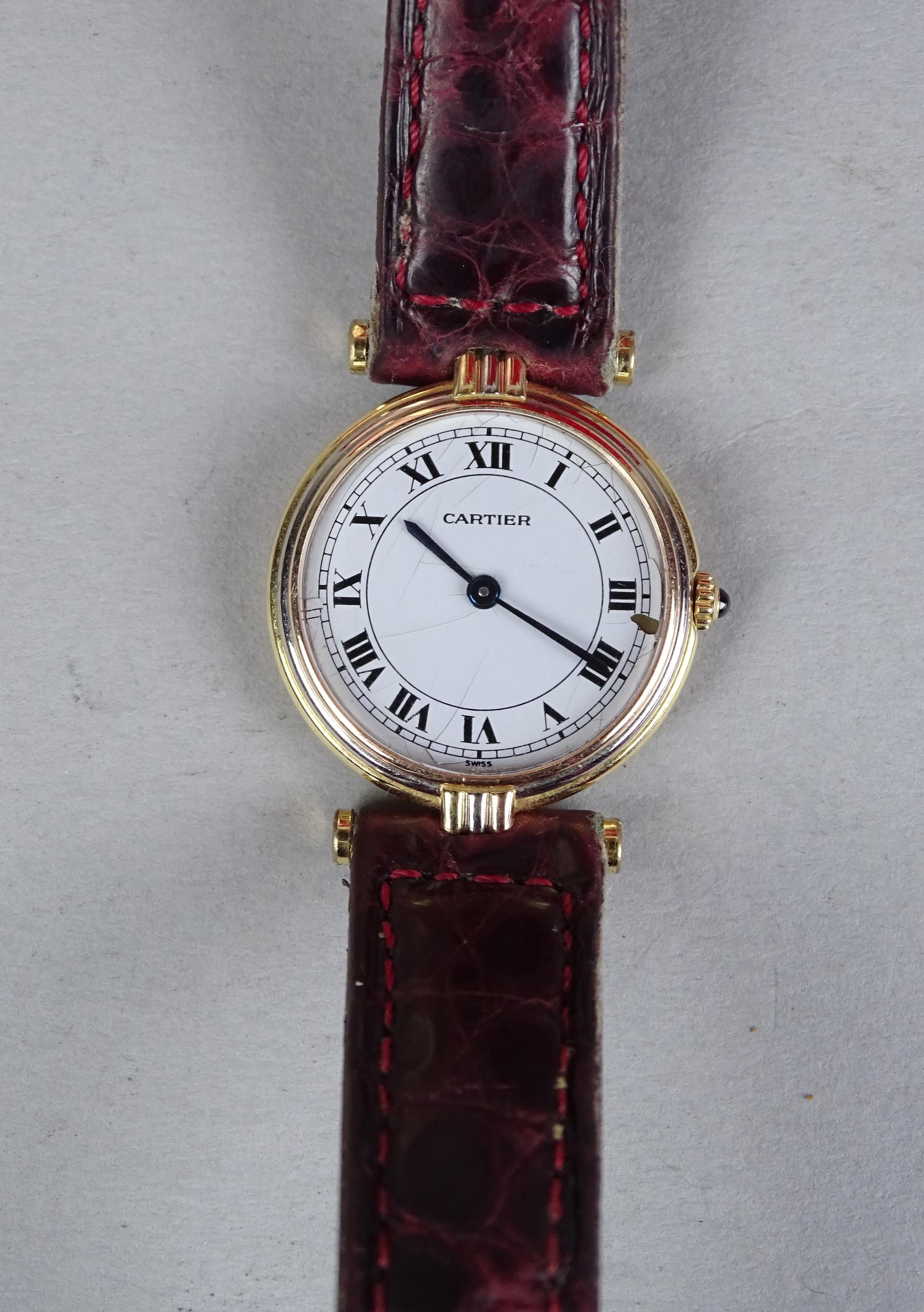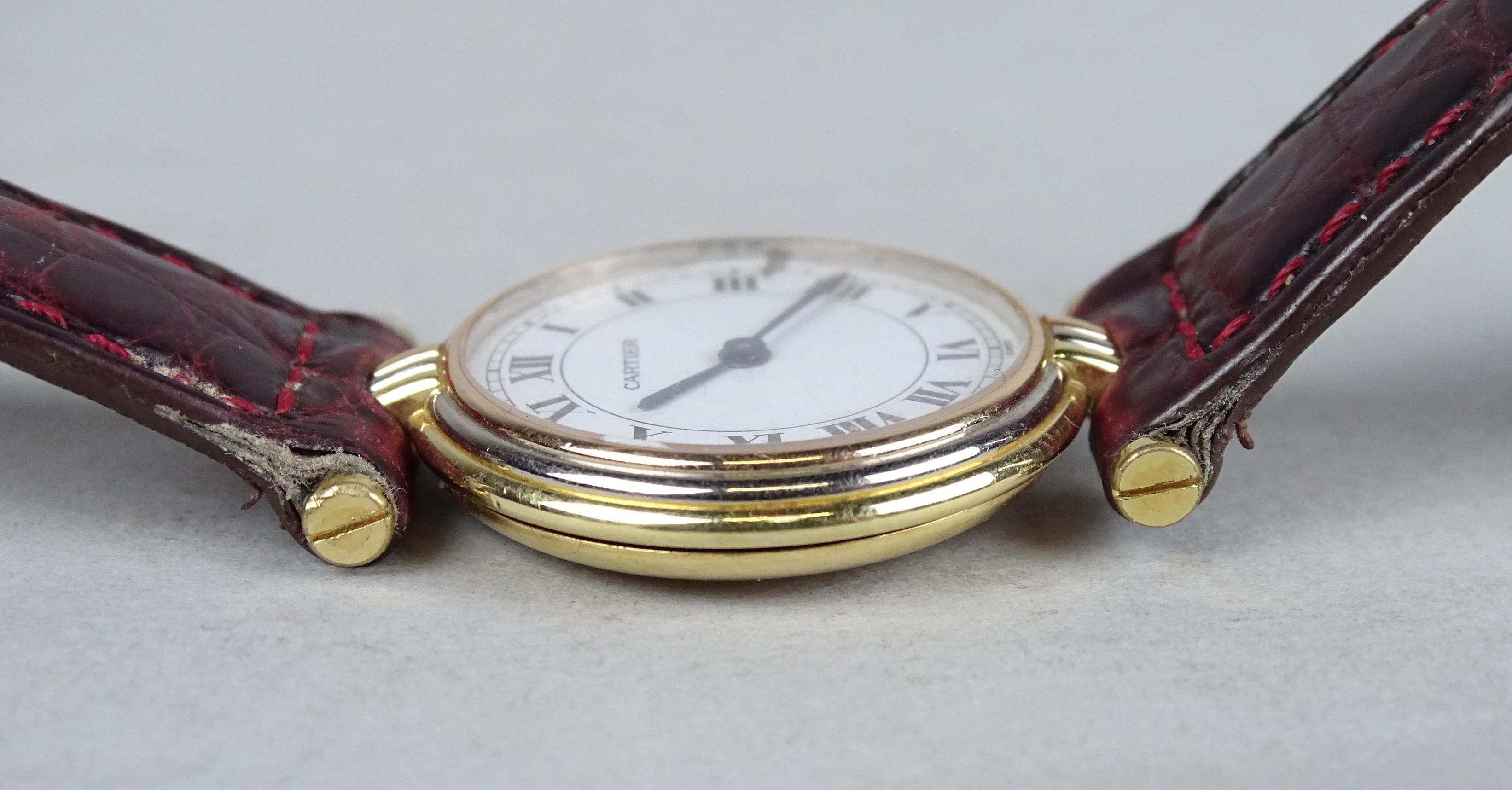 Bijou: Montre bracelet de dame CARTIER modèle Vendôme boitier en or 3tons 18K mvt à quartz (ds l'état, cadran acc) boucle en métal doré D:25mm Pbrut:18,7g bracelet (usures)