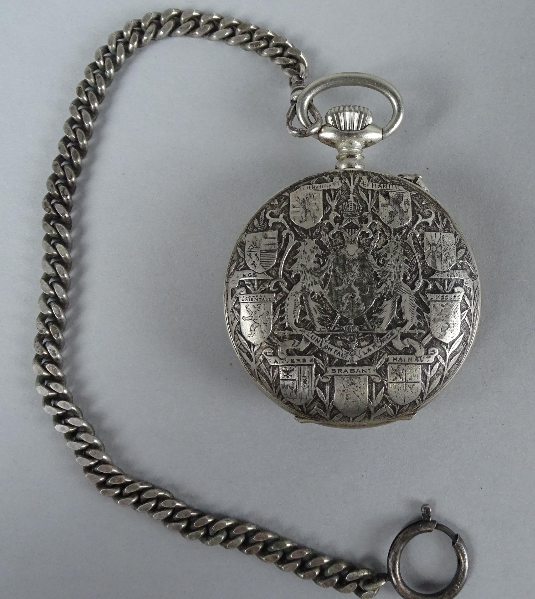 Bijou: Montre de gousset -L'heure nationale Belge- cuvette ext aux 9 provinces F.E. ROSKOPF en métal argenté mvt à remontoir (En état) D: 54mm