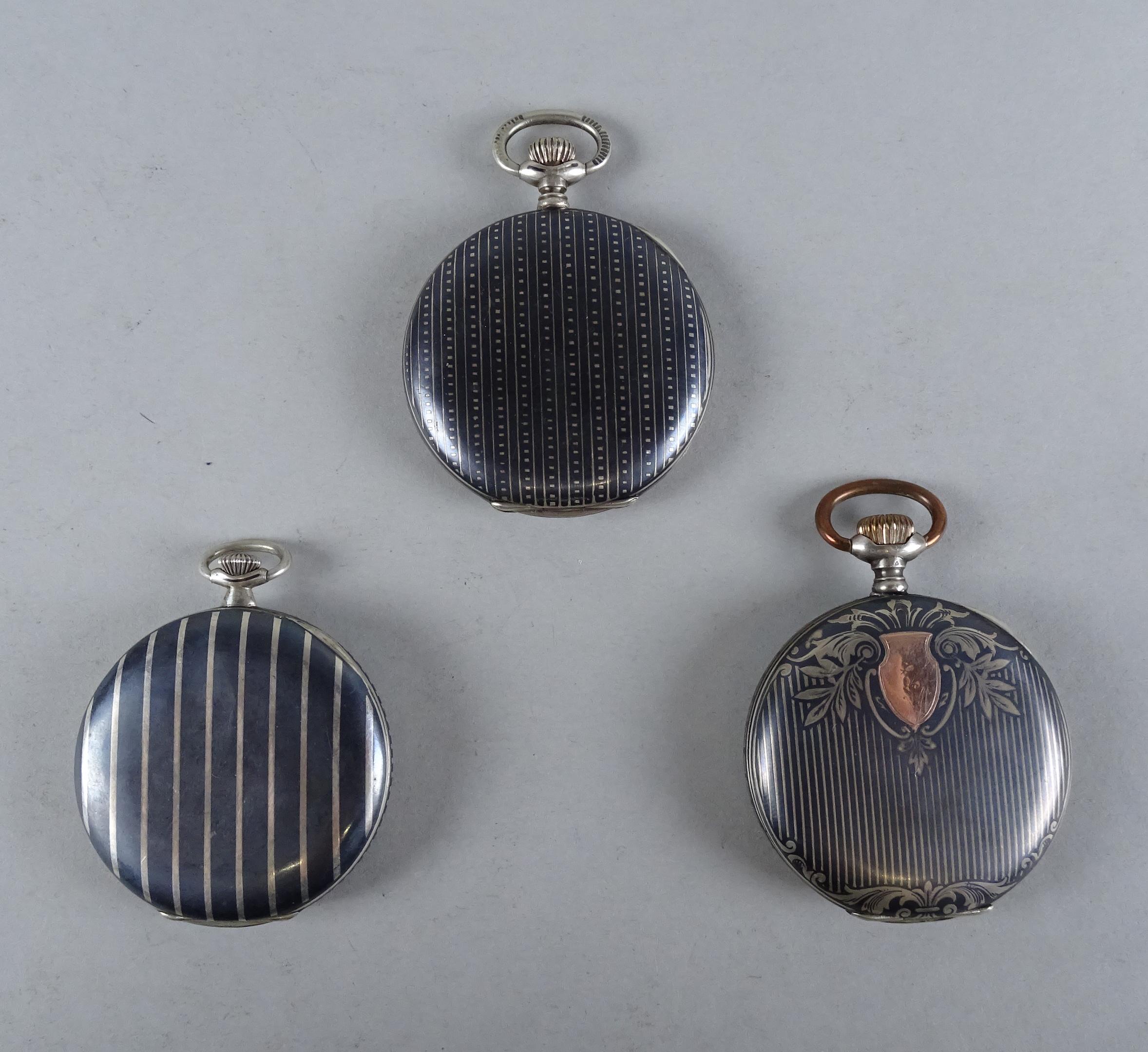 Bijou: Montre de gousset en argent niellé mouvement à remontoir (3) (En état): Savonnette Tavannes Watch (mqe), IAXA, Chronomètre L.Nicolas Liège (3pcs)