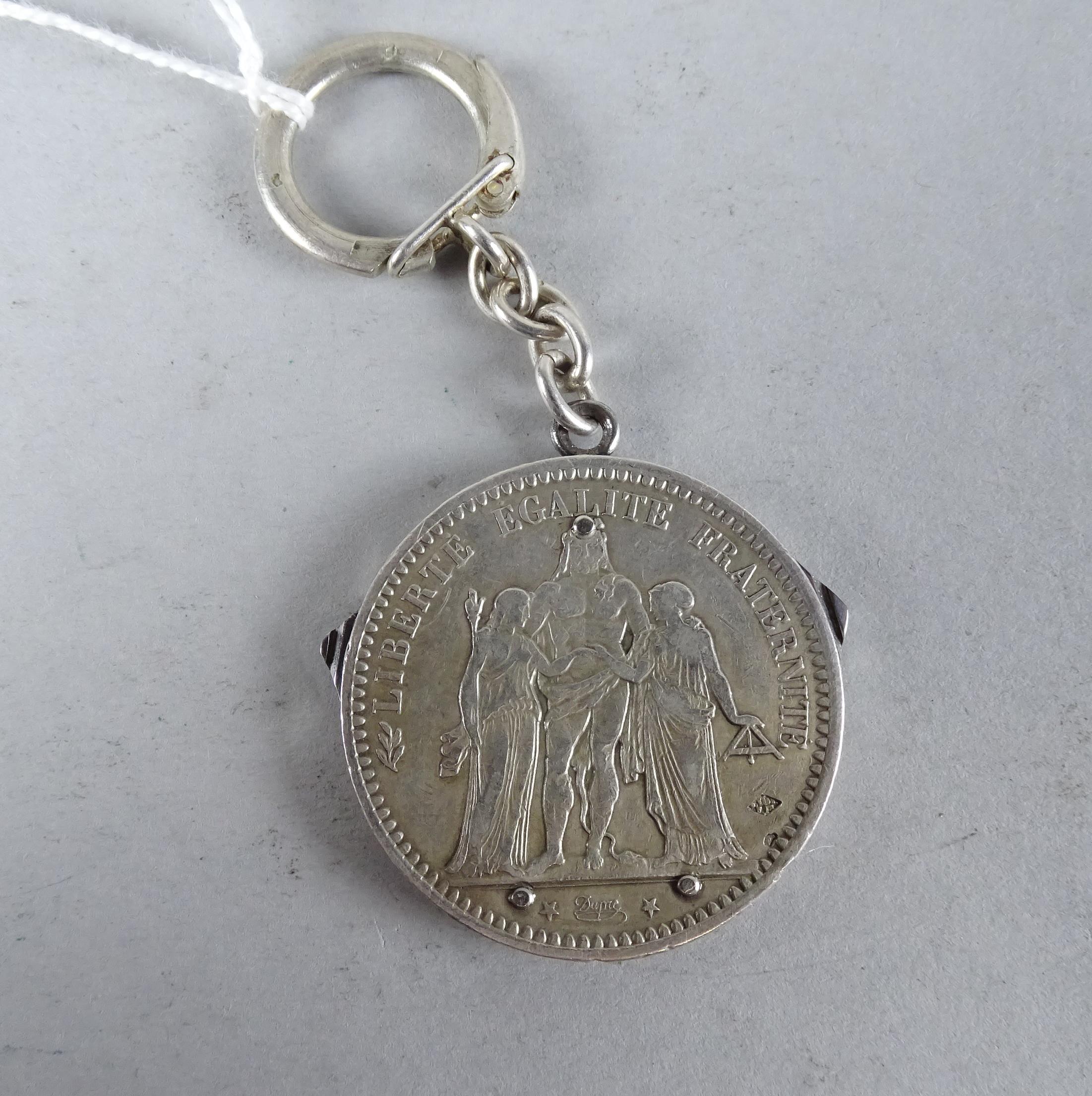 Bijou: Pièce de 5F en argent Hercule 1873 à système ELOI PERNET pour HERMES Paris kit manucure, ciseau, canif et lime total 33,2g diam: 3,7cm