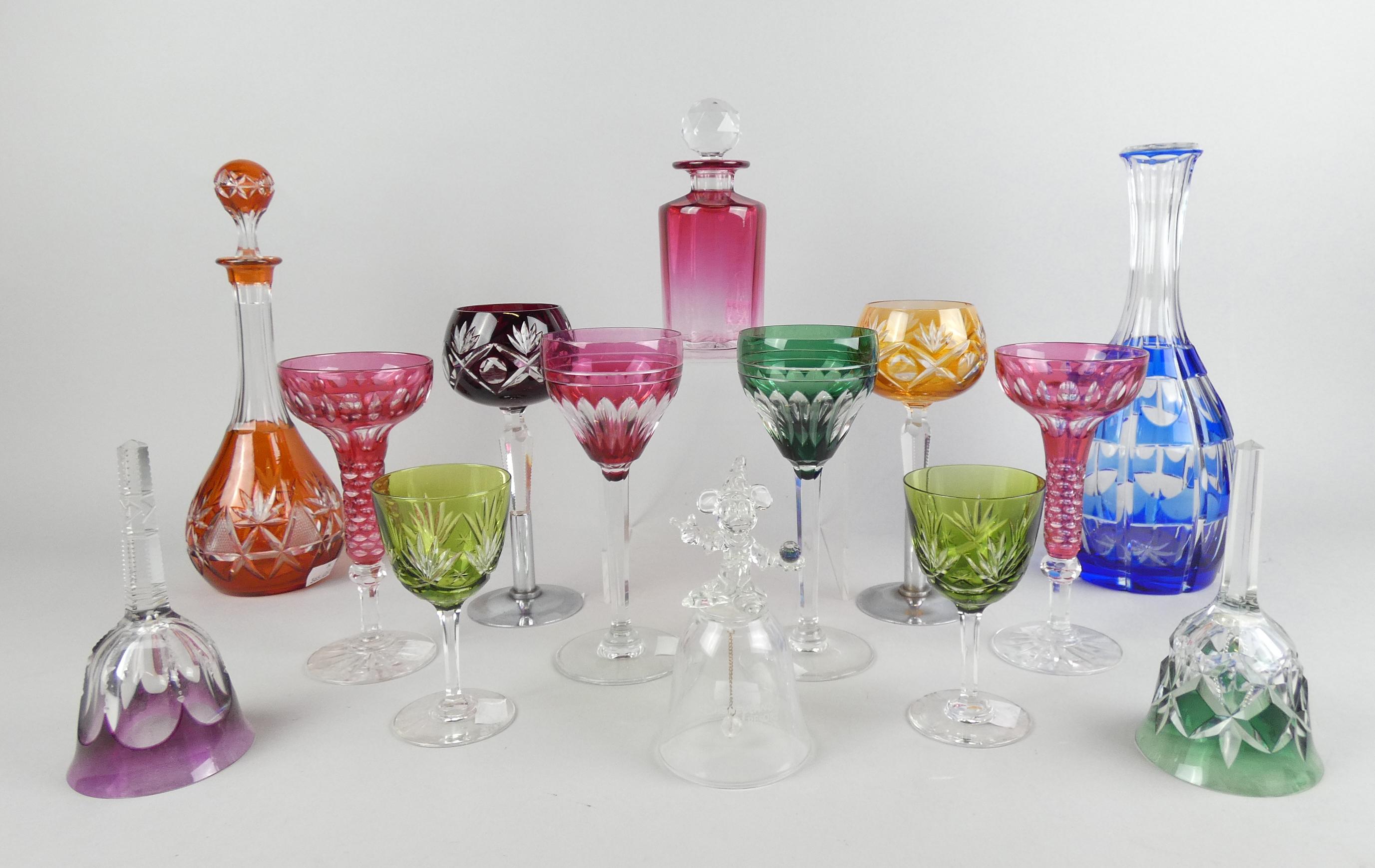 Verrerie: objets en verre et cristal dont carafes (egr, mqe), verres en cristal, clochettes,... (14pcs)
