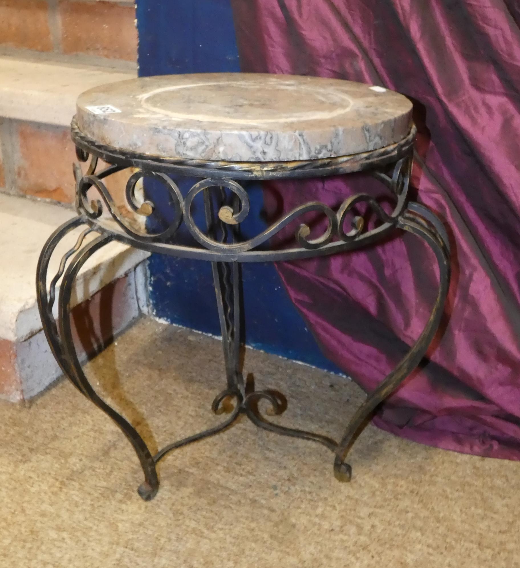 Meuble: Table guéridon monture en fer forgé et plateau rond en marbre de Rance (trace calcaire) H: 49cm Diam: 43cm