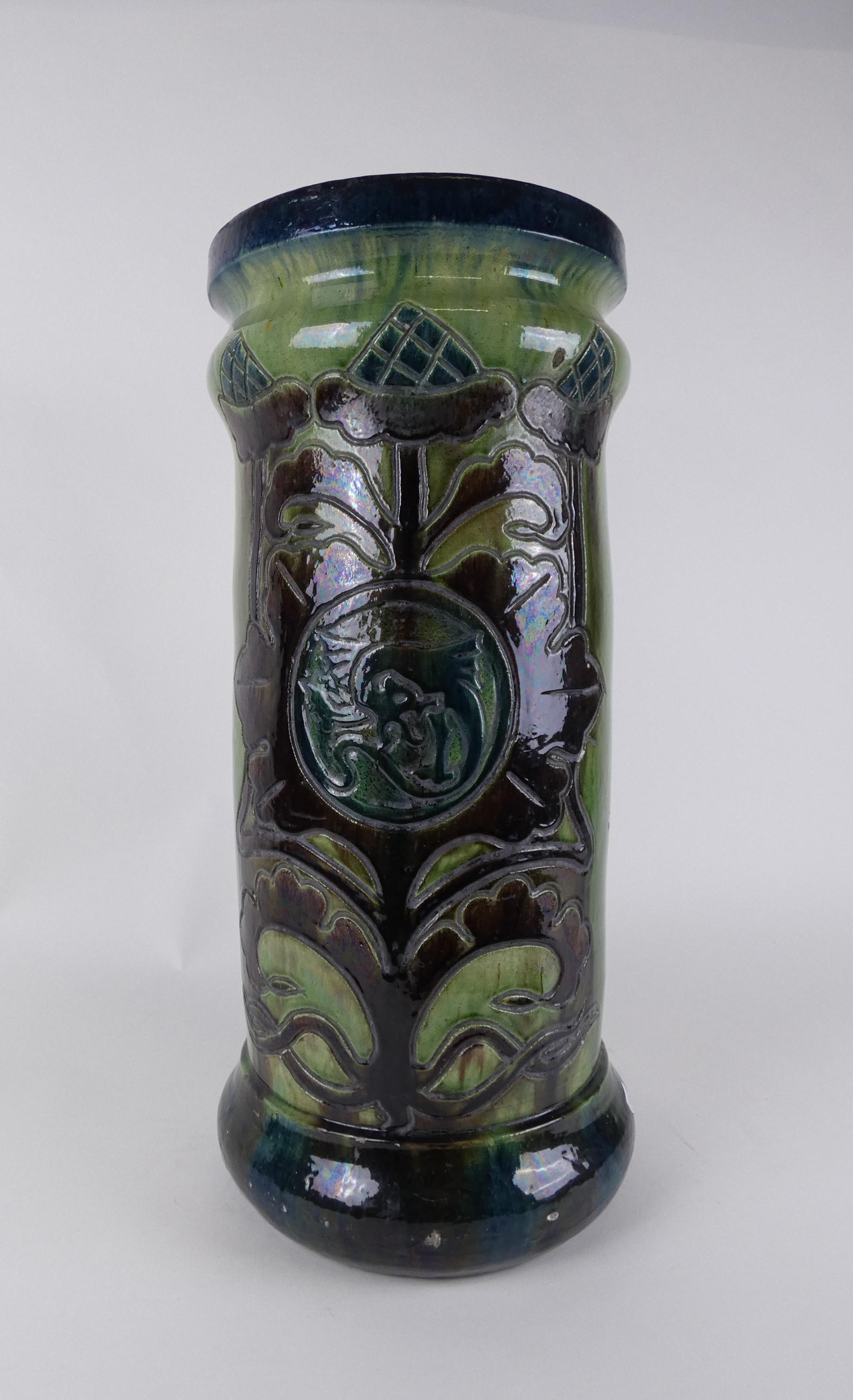 Céramique: Porte-parapluie en faïence flamande (egr, ecl) à décor d'un blason stylisé -dragon- H:62,5 Diam:26,5cm