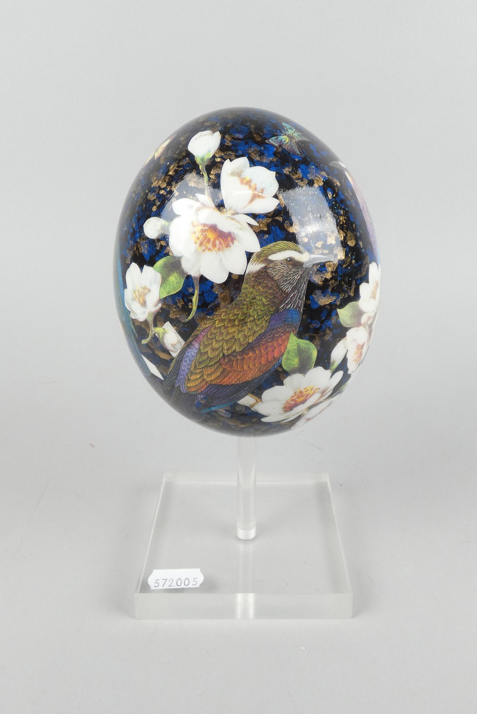 Objet: Oeuf d'autruche décor d'oiseau et de fleurs signé ROWE Sherry H:11cm sur socle en plexi
