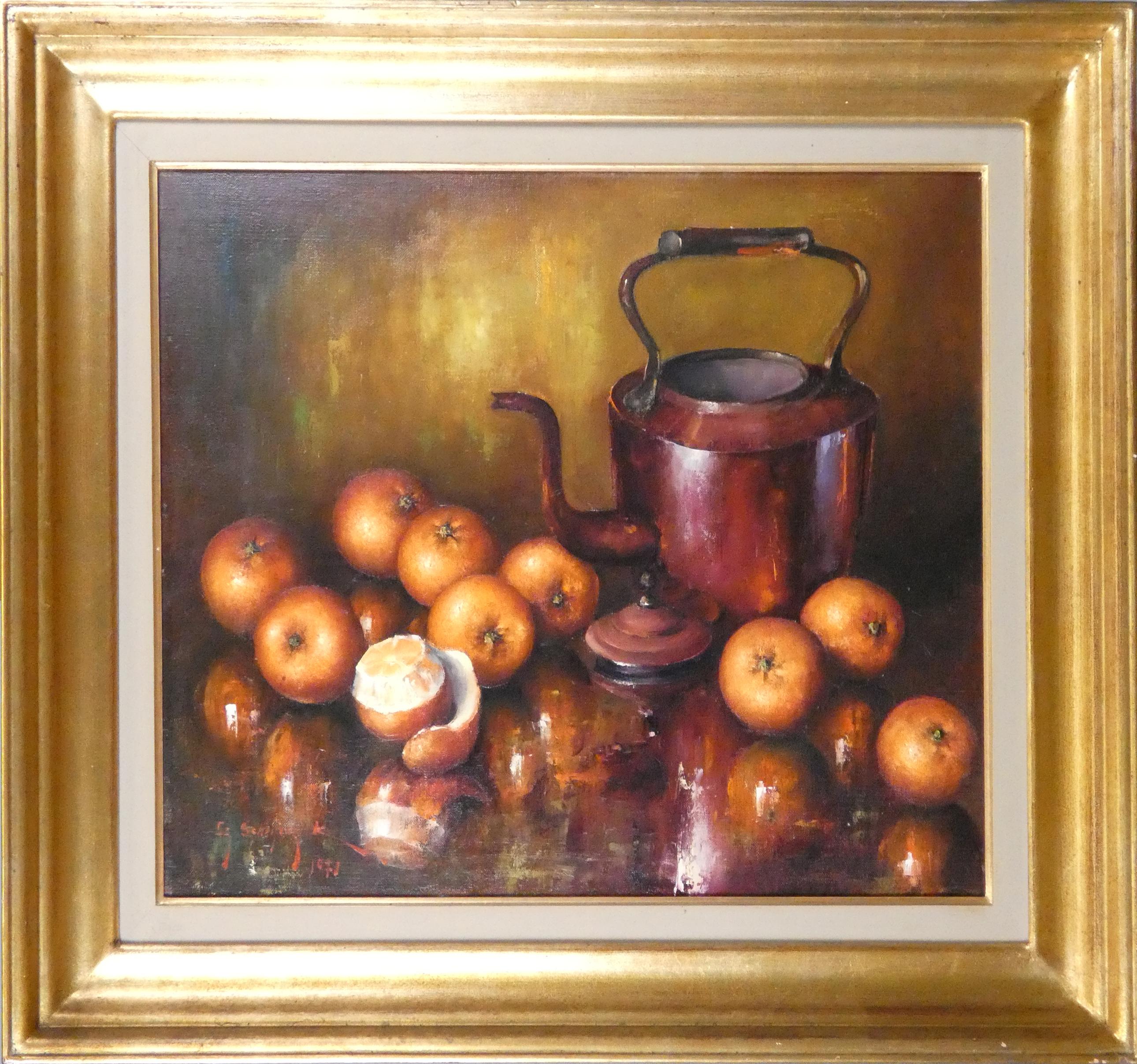 Tableau HST -Nature morte à l'orange- daté 1971 signé (illisible) 50x60cm cadre