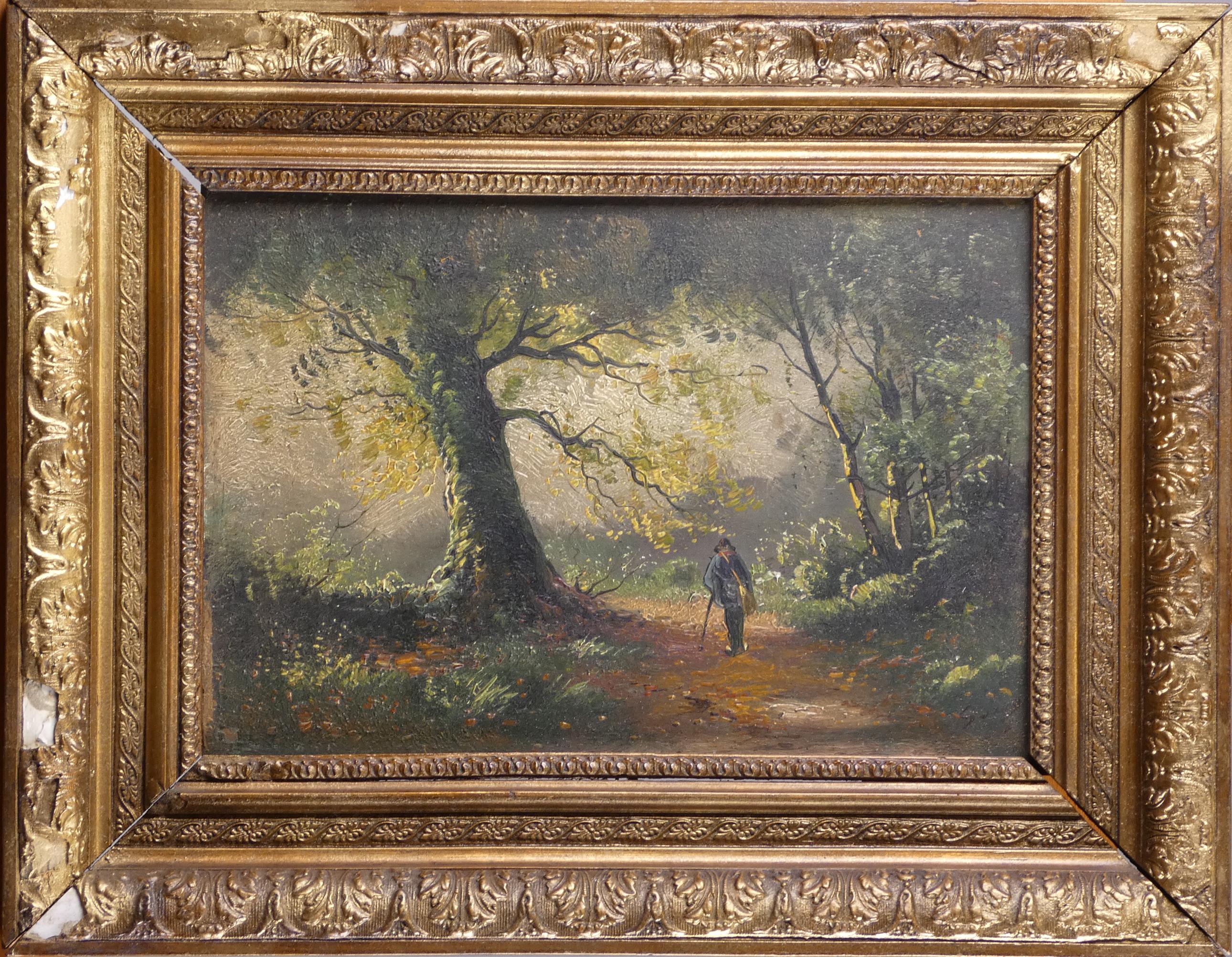 Tableau HSB -Sous-bois animé- signé (école belge fin 19eS) 20x30cm cadre de style doré (lacunes)