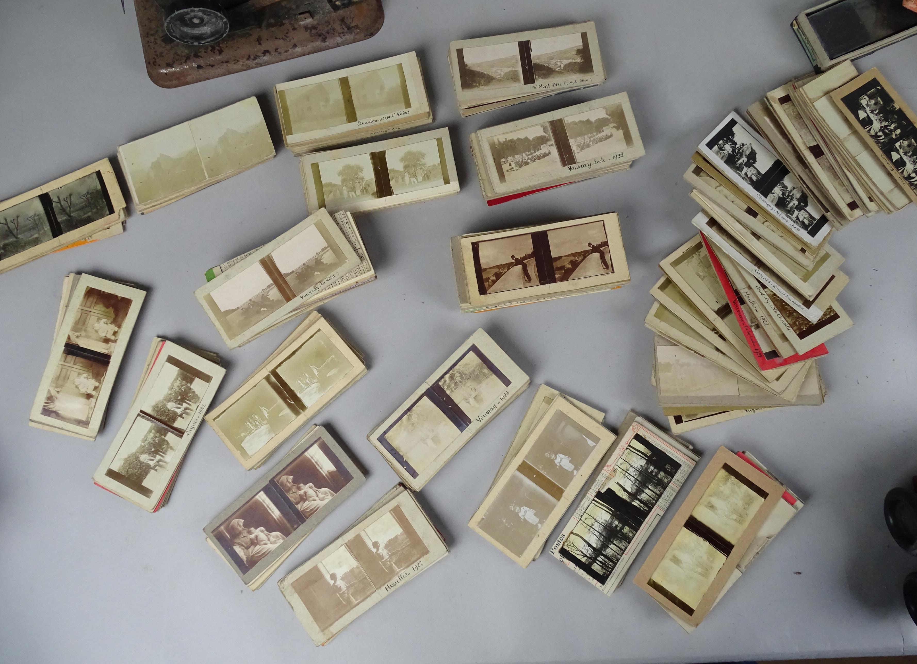 Objets: Stéréoscope en bois avec important lot de photos sur carton et plaques d