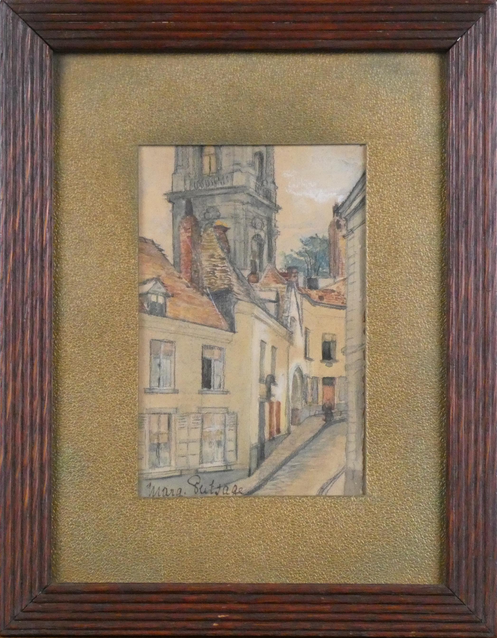 Tableau: aquarelle -Vue de la rue Cronque sur le beffroi de Mons- signé *PUTSAGE M.* (Marguerite) (1868, 1946) 13x9cm cadre bois s/v
