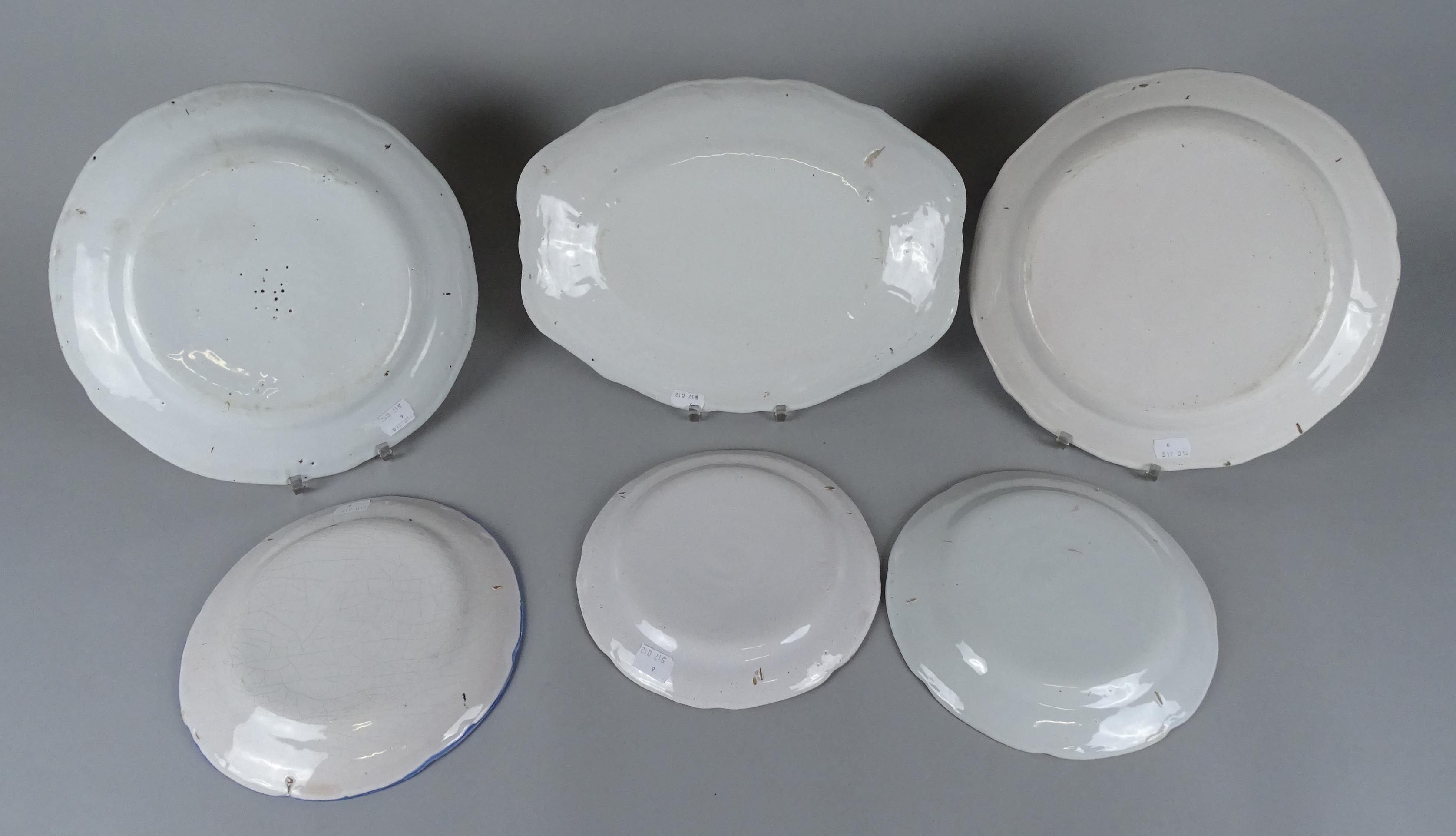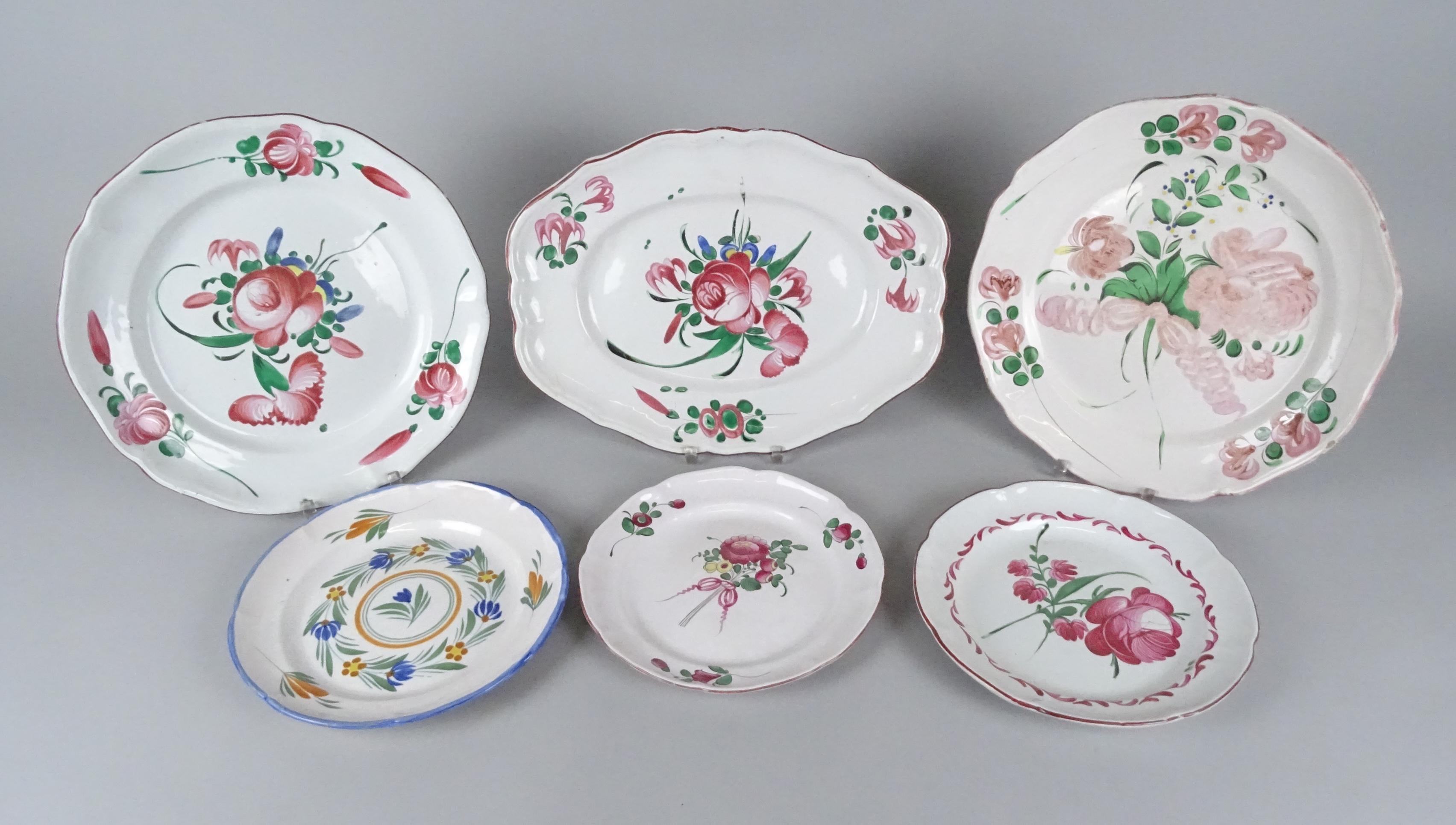 Céramique: (6) 3 plats et 2 assiettes en faïence (1 avec egr) Les Islettes à décor de fleurs 18eS et 19eS + 1 ass faïence française (6 pcs)