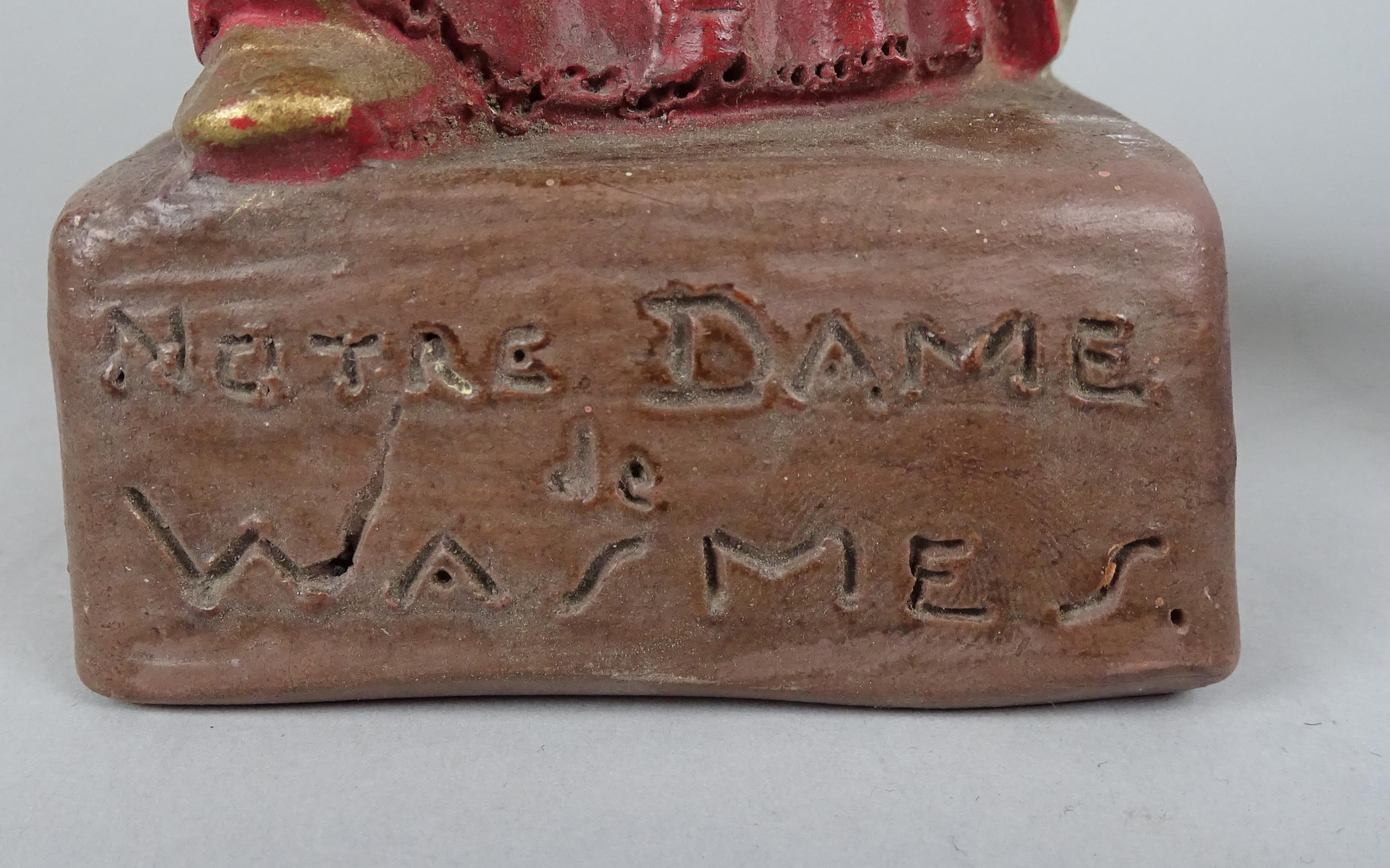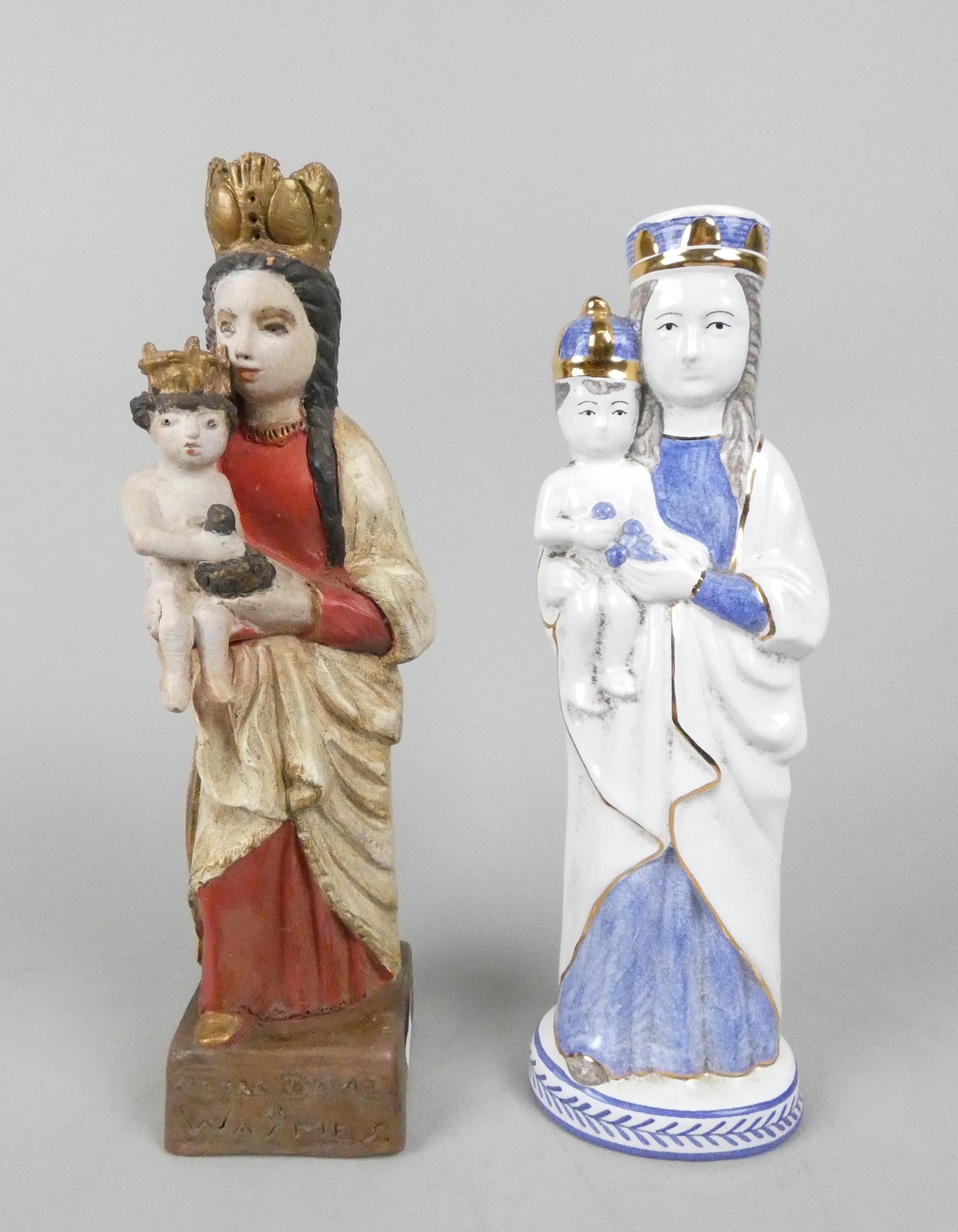 Céramique: (2pcs) -Vierge à l'enfant- de Sars la Bruyère avec certificat H:31cm + -Notre-Dame de Wasmes- signé LEINNE François (20eS) H:33,5cm