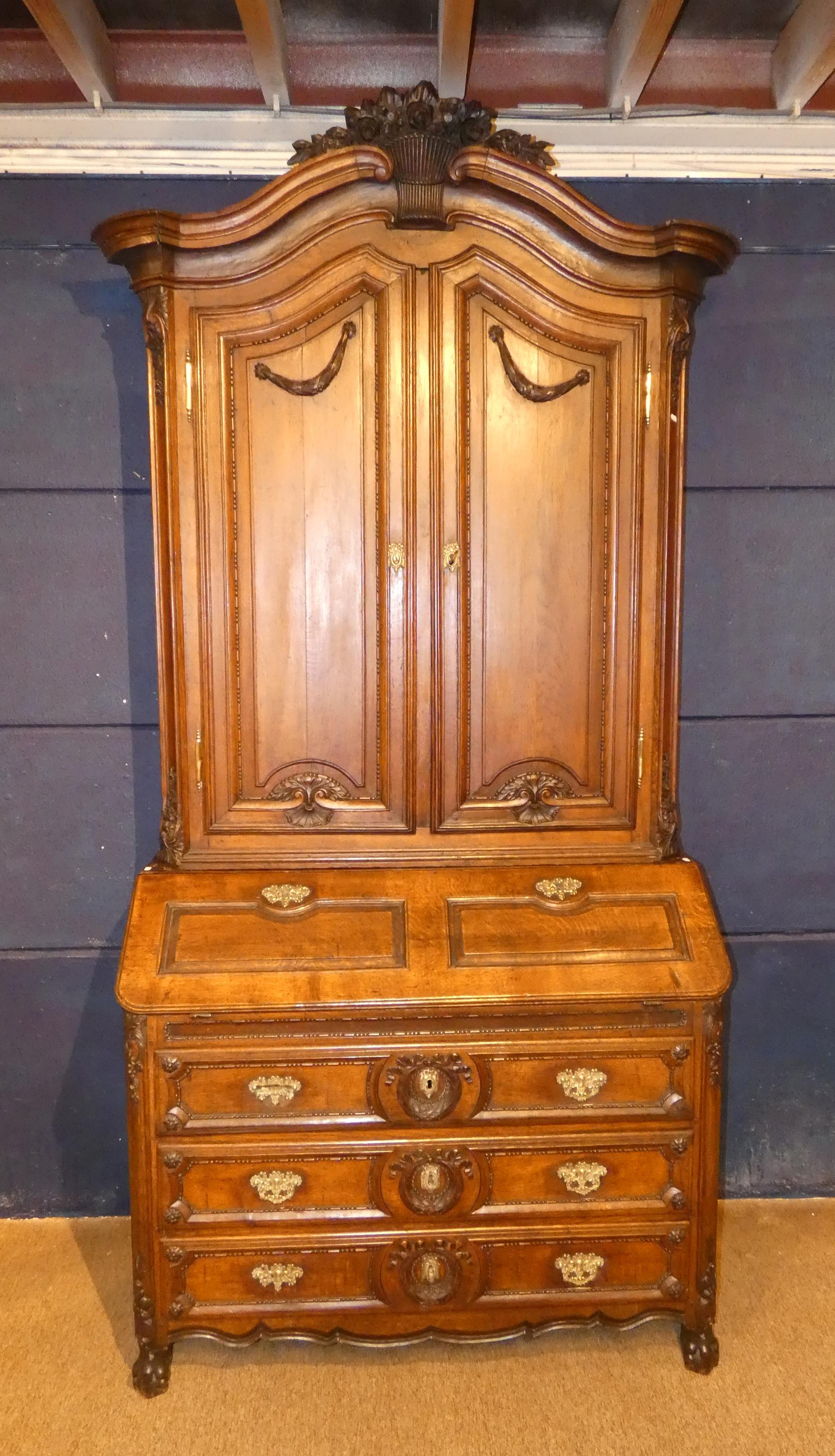 Meuble: Scriban Namurois 2 corps en chêne 3 tiroirs 1 tablette (comprenant 6T) 2portes chapeau de gendarme sculpté au panier fleuri 278x130x62cm