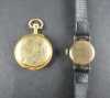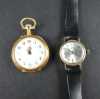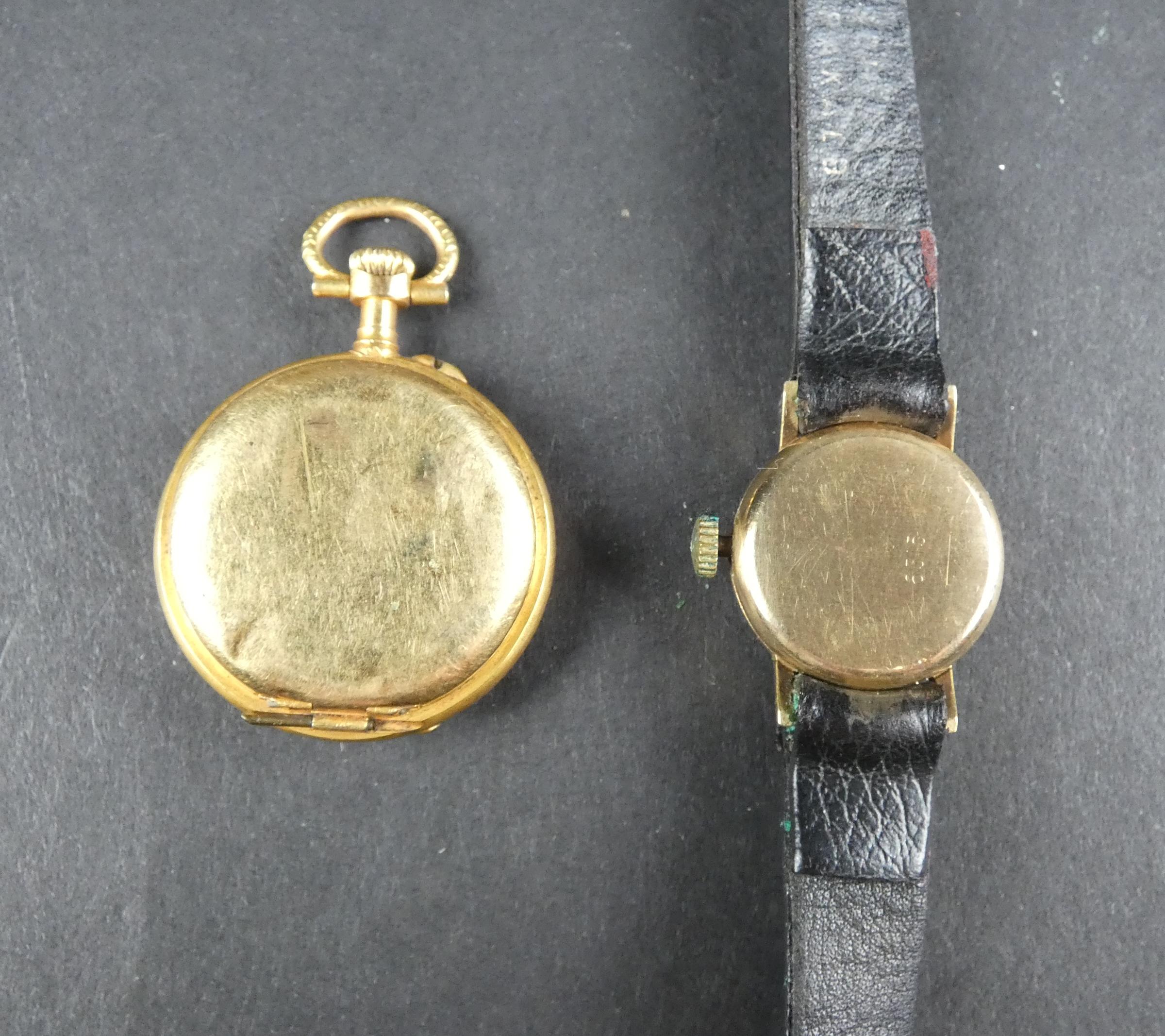 Bijou: Montre bracelet de dame en or jaune 14k P tot: 8,2g + montre de gousset de col (Ds l'état, mq cuvette ext) en or 18k P tot: 10,2g