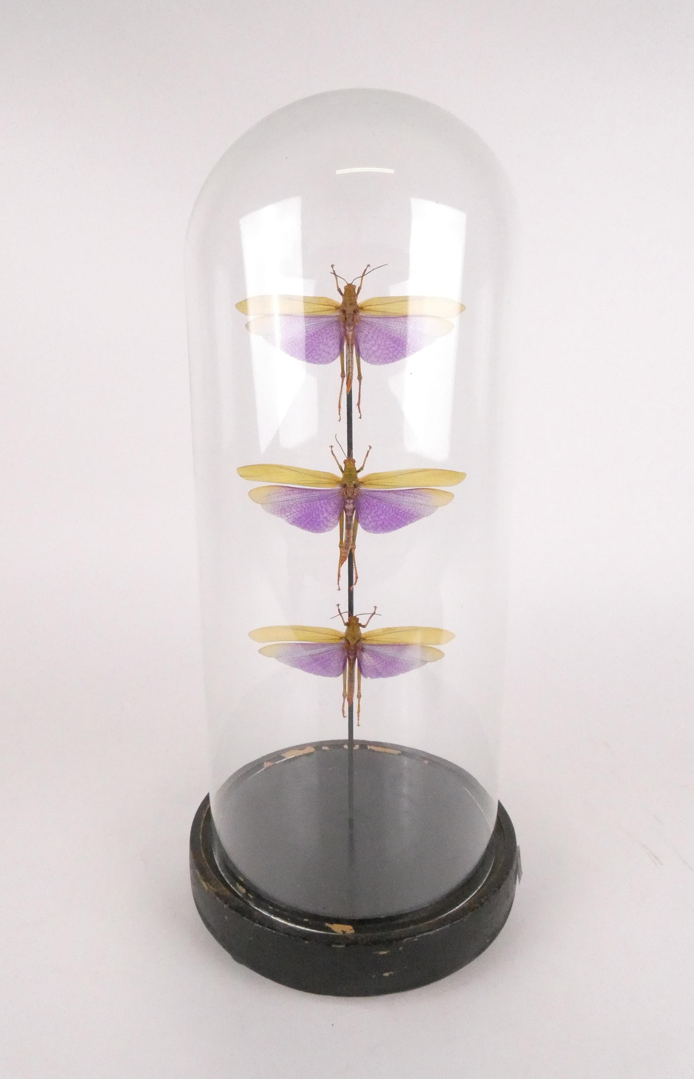 Taxidermie: 3 grands criquets TITANACRIS ALBIPES sous globe H:46cm