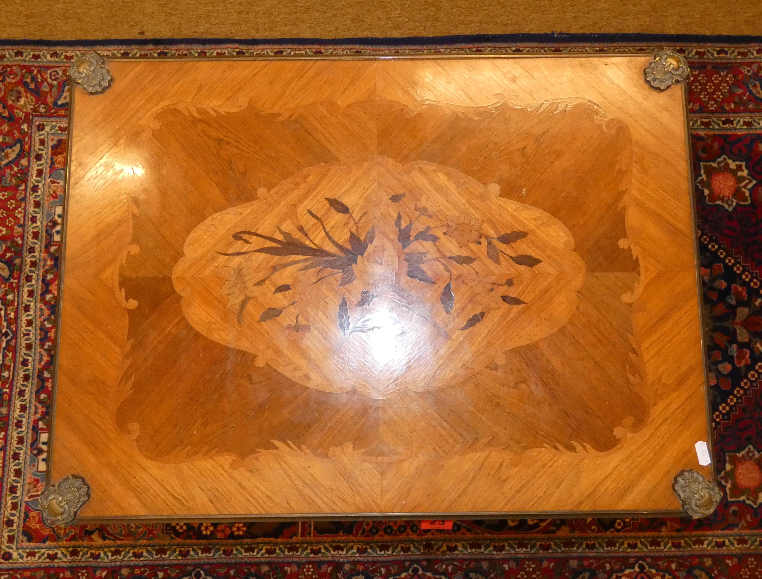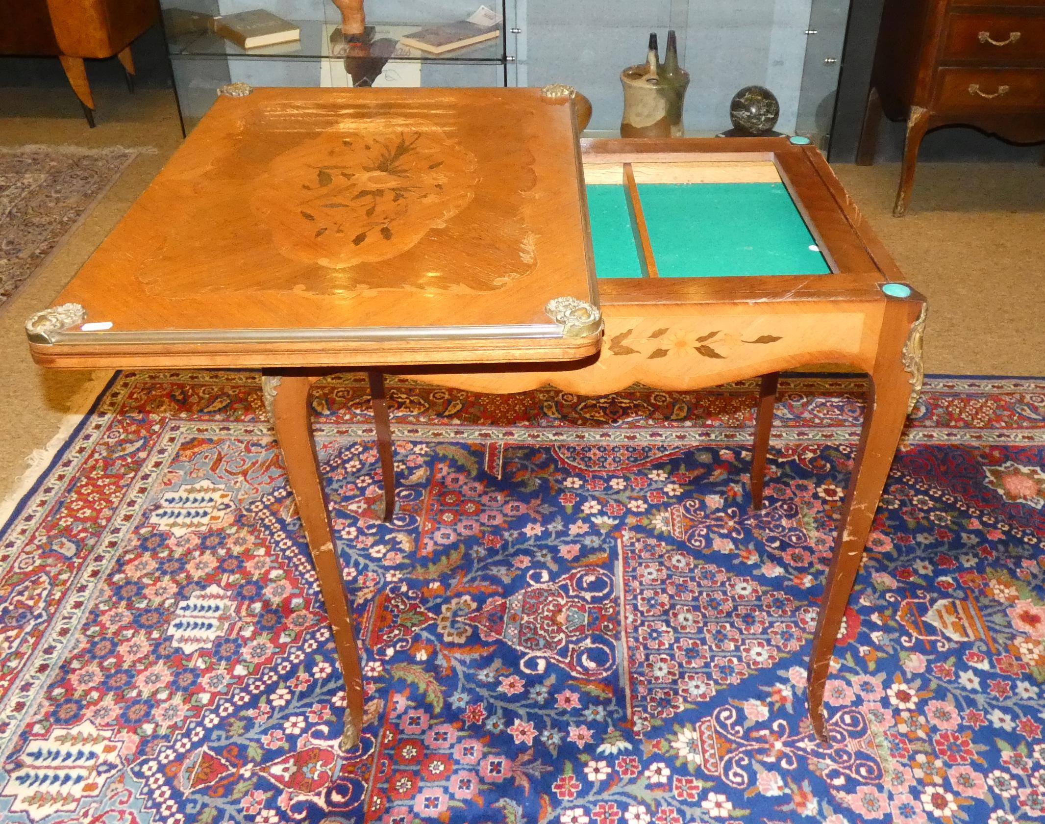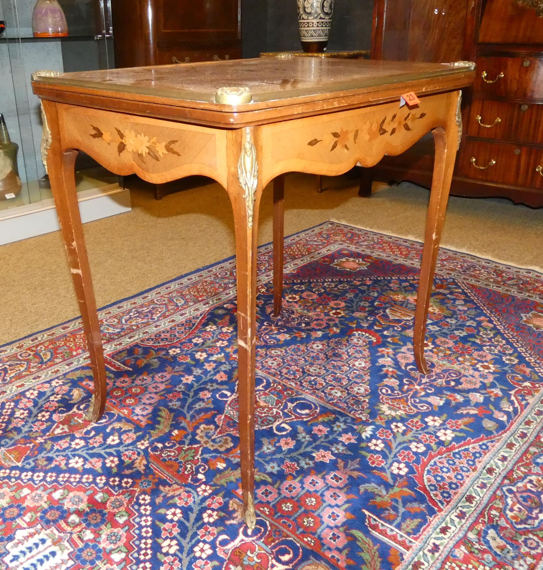 Meuble: Table à jeux de style (usure d'usage) en marqueterie de bois de rose milieu 20eS appliques en bronze tablette pivotante ouvrante 75x72x53cm