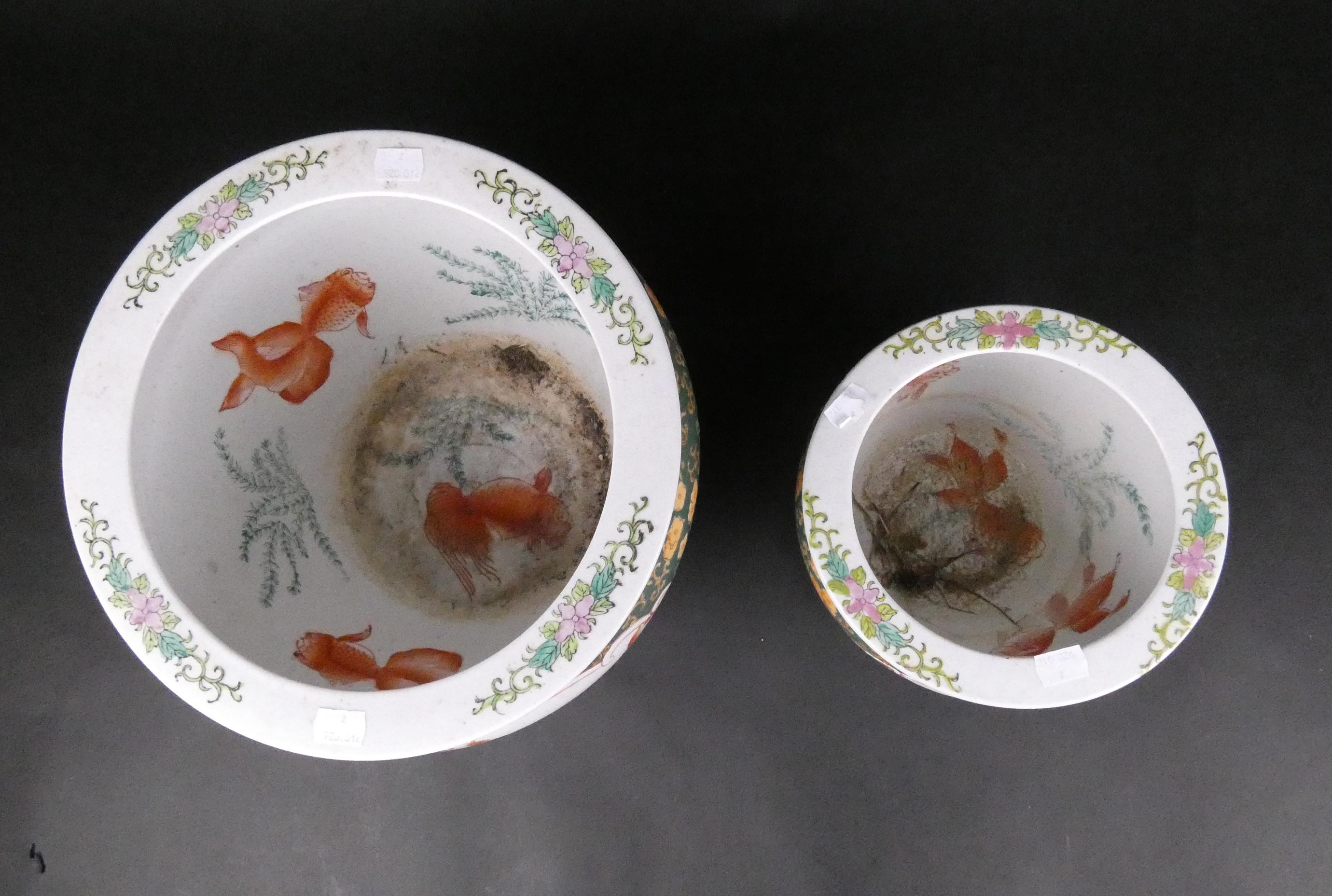 Asiatique: Aquarium/ cache-pot (2pcs) en porcelaine de CHINE décor de réserve d'oiseaux et de végétaux H:17 et 25cm Diam:21,5 et 31,5cm