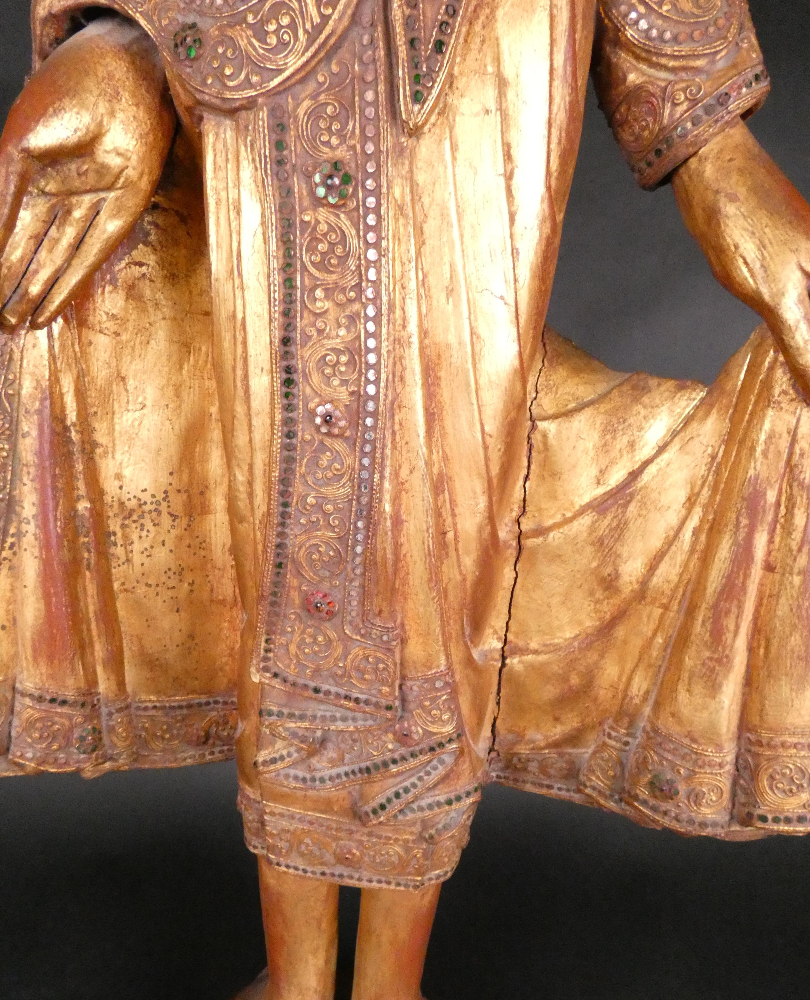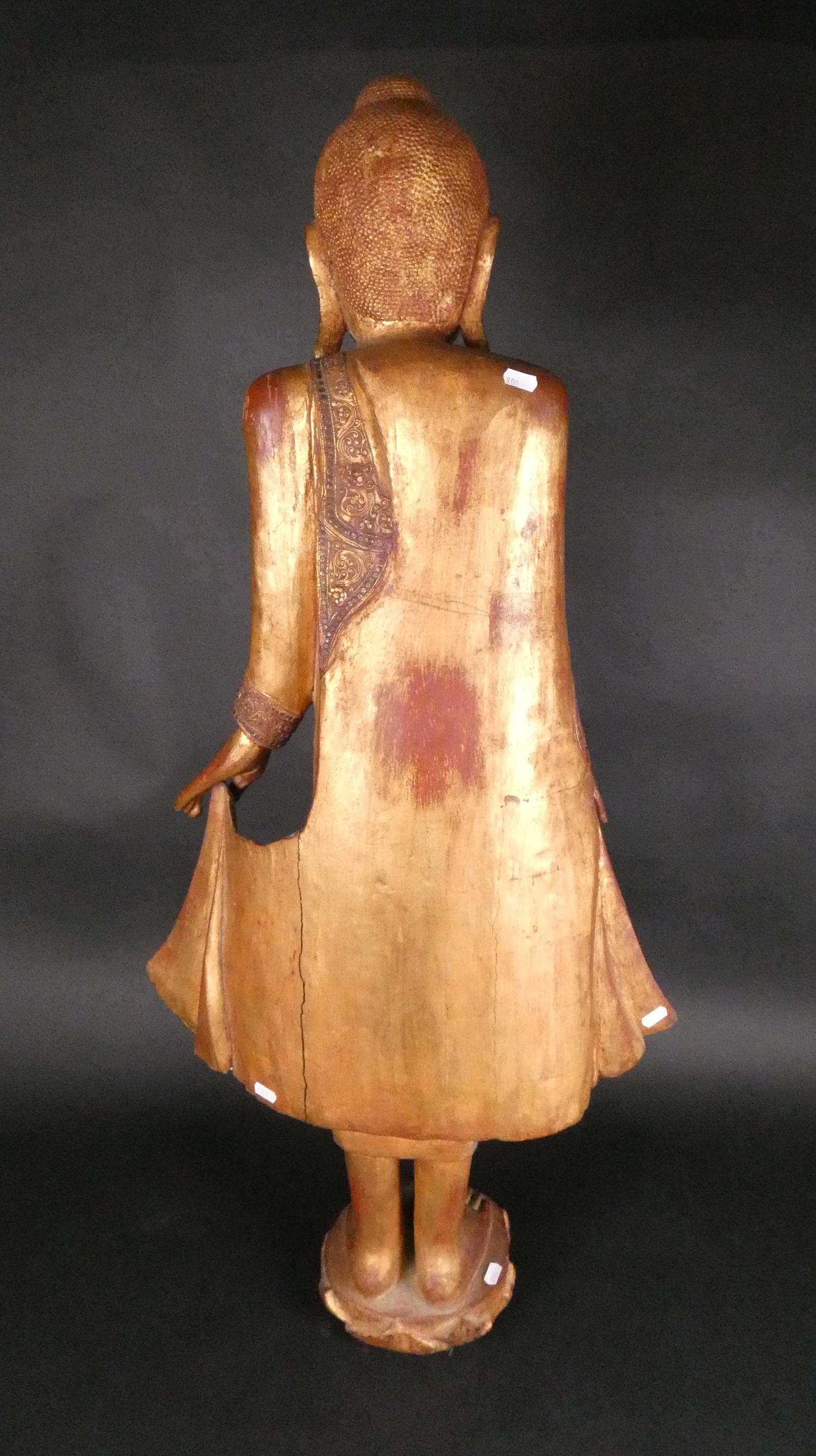 Asiatique: Sculpture Bouddha en bois doré BIRMANIE (fissure importante pans de robe) debout tenant son habit monastique rehauts de verroterie H:114cm