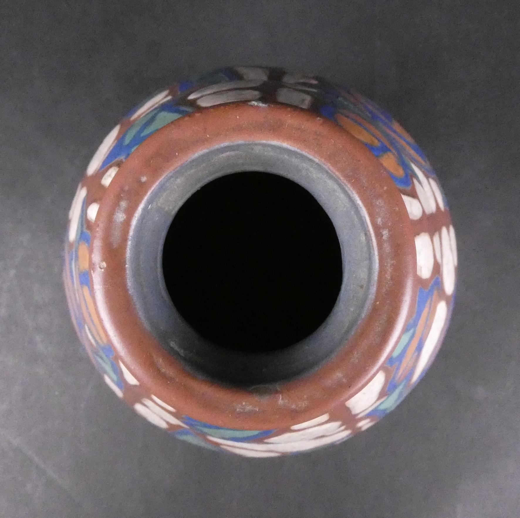 Céramique: Vase en faïence piriforme signé en creux REVERNAY en céramique polychrome décor de formes géométriques H:23cm
