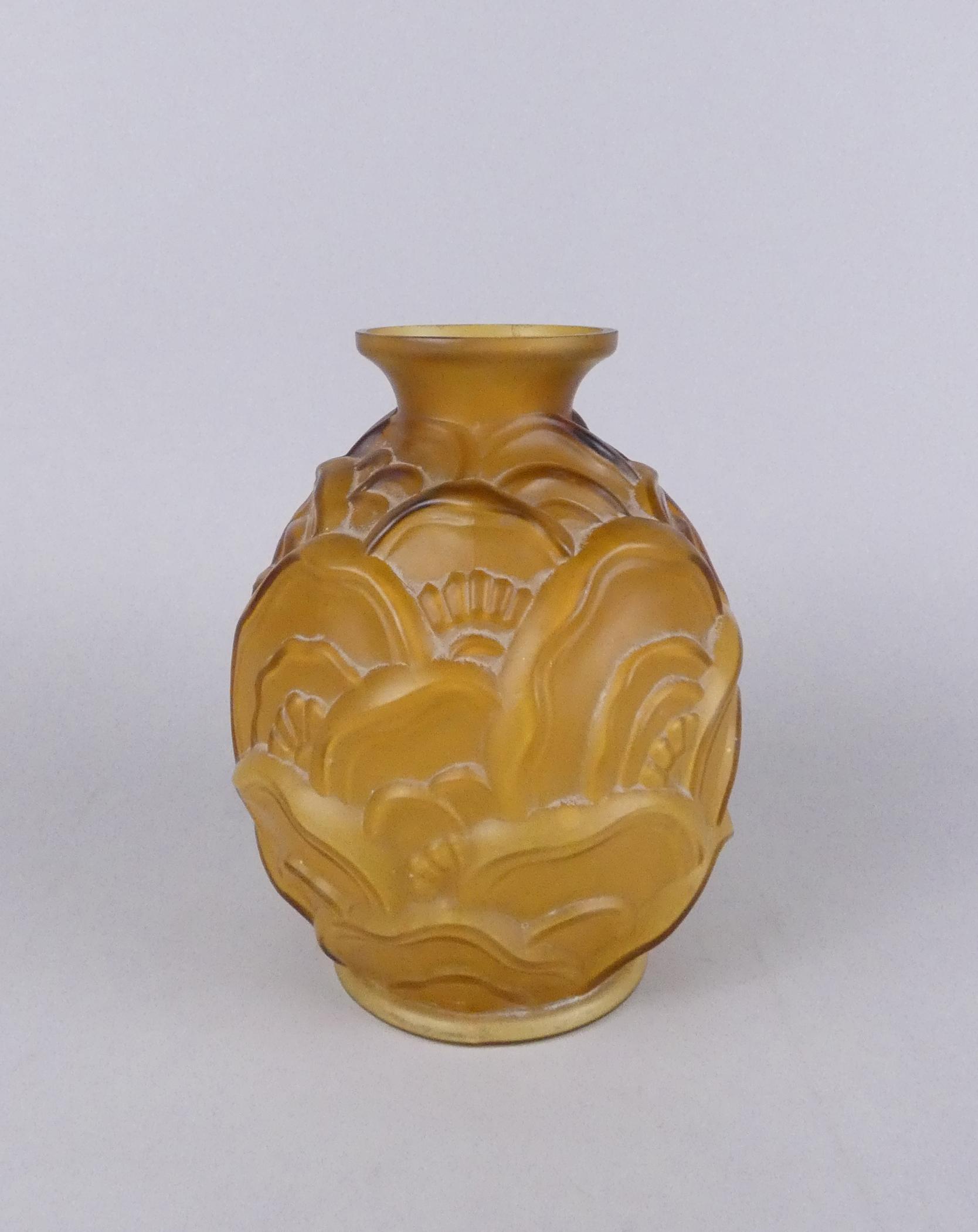 Verrerie : Vase Art Déco en verre moulé (egr , pt ecl) SCAILLMONT signé CATTEAU Charles