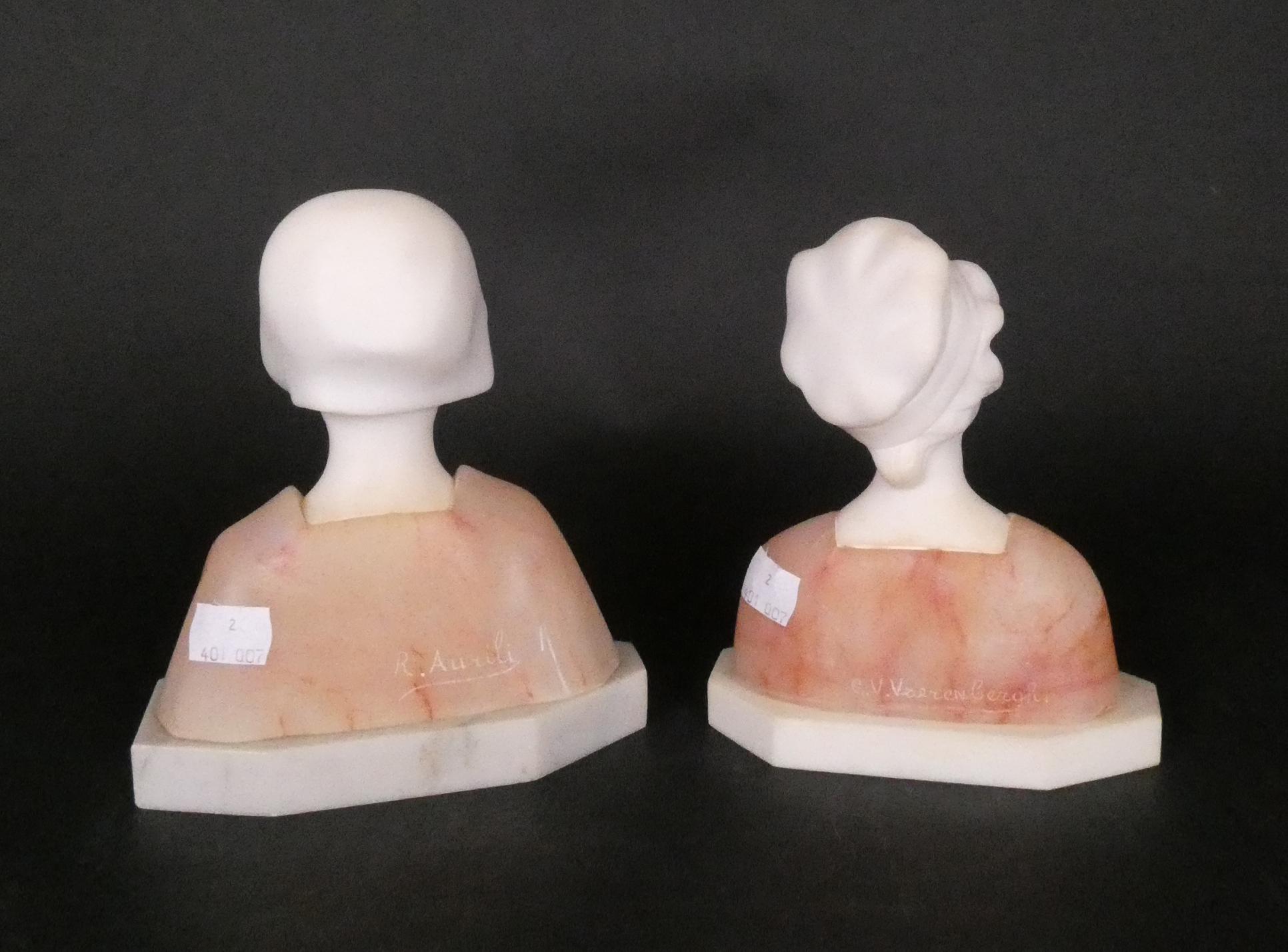 Sculpture: 2 bustes en albâtre -jeune femme- et -jeune fille- signé *VAN VAERENBERGH G.*(Gustave) (1873, 1927) et *AURILI R.* (Richard) (1864, 1943) socle en marbre H:17cm