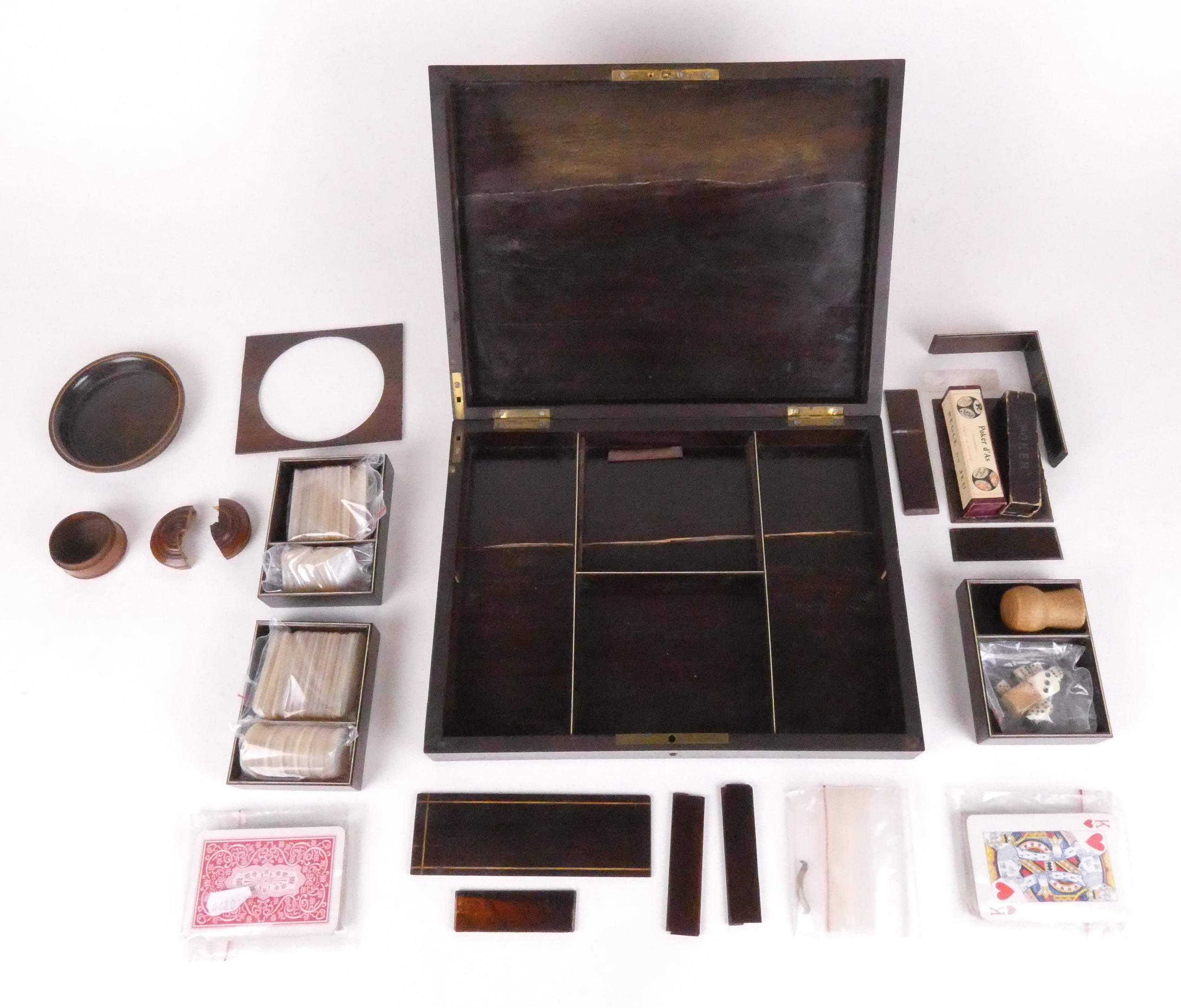 Jouet: Boite à jeux en bois noirçi et marqueterie de laiton fin 19eS (dessous fendu, mqe) avec jetons en nacre et jeu de poker 6x30x23cm