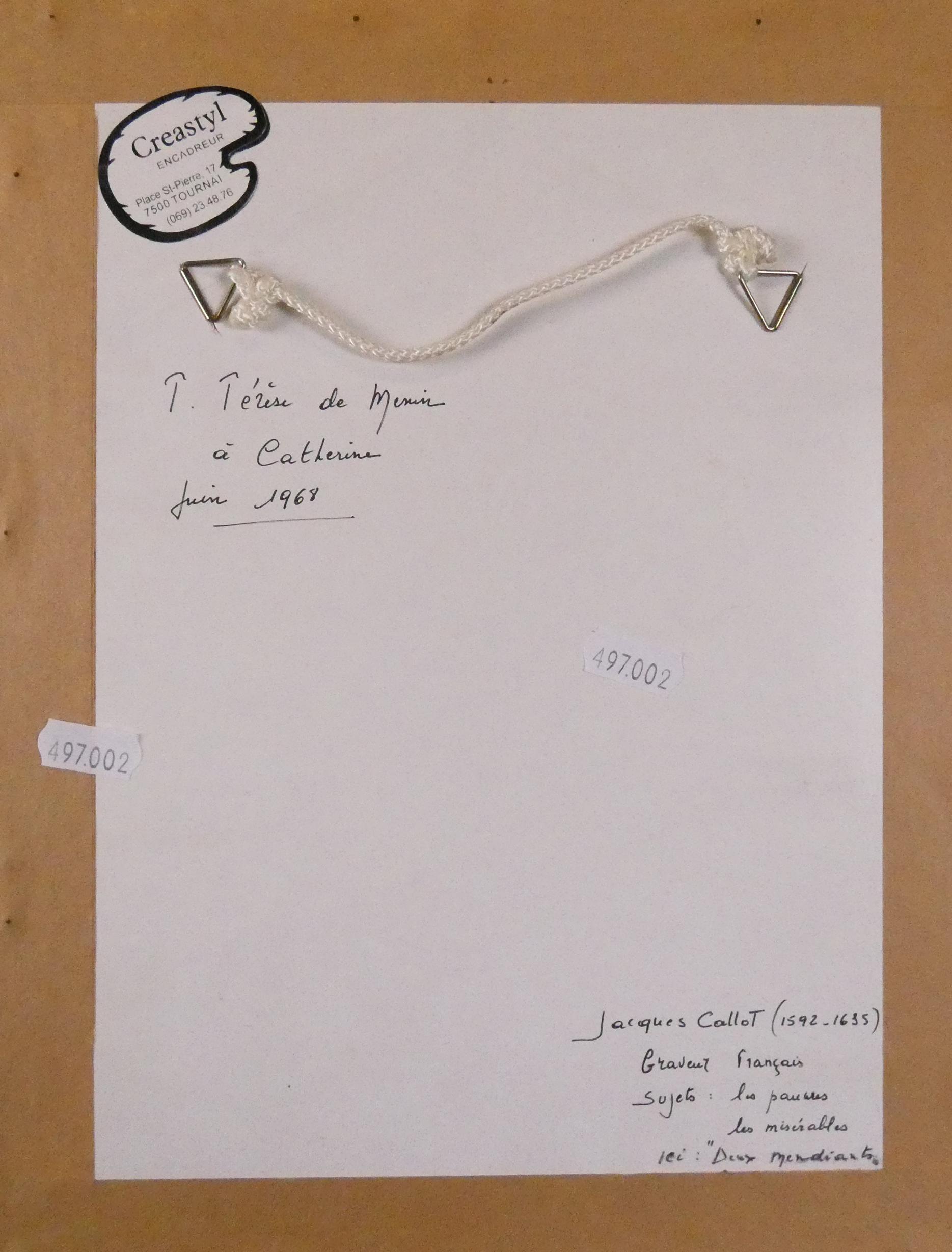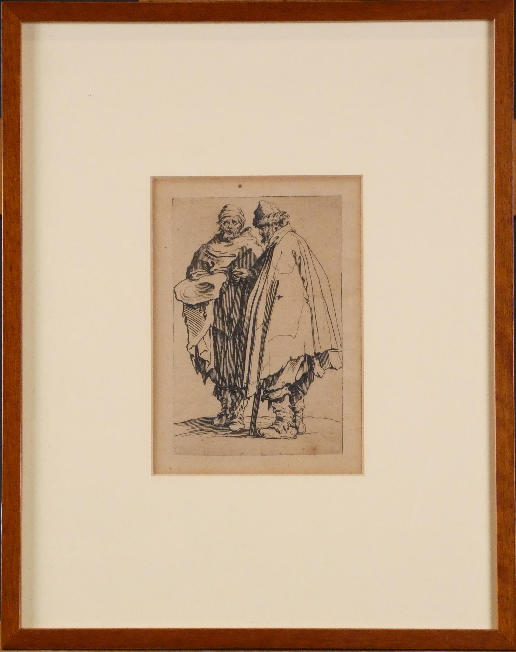 Estampe: Eau-forte (micro-déchirures, légères taches) -Les mendiants- attribué à *CALLOT J.* (Jacques) (1592, 1635) 14x9,5cm cadre bois sous verre