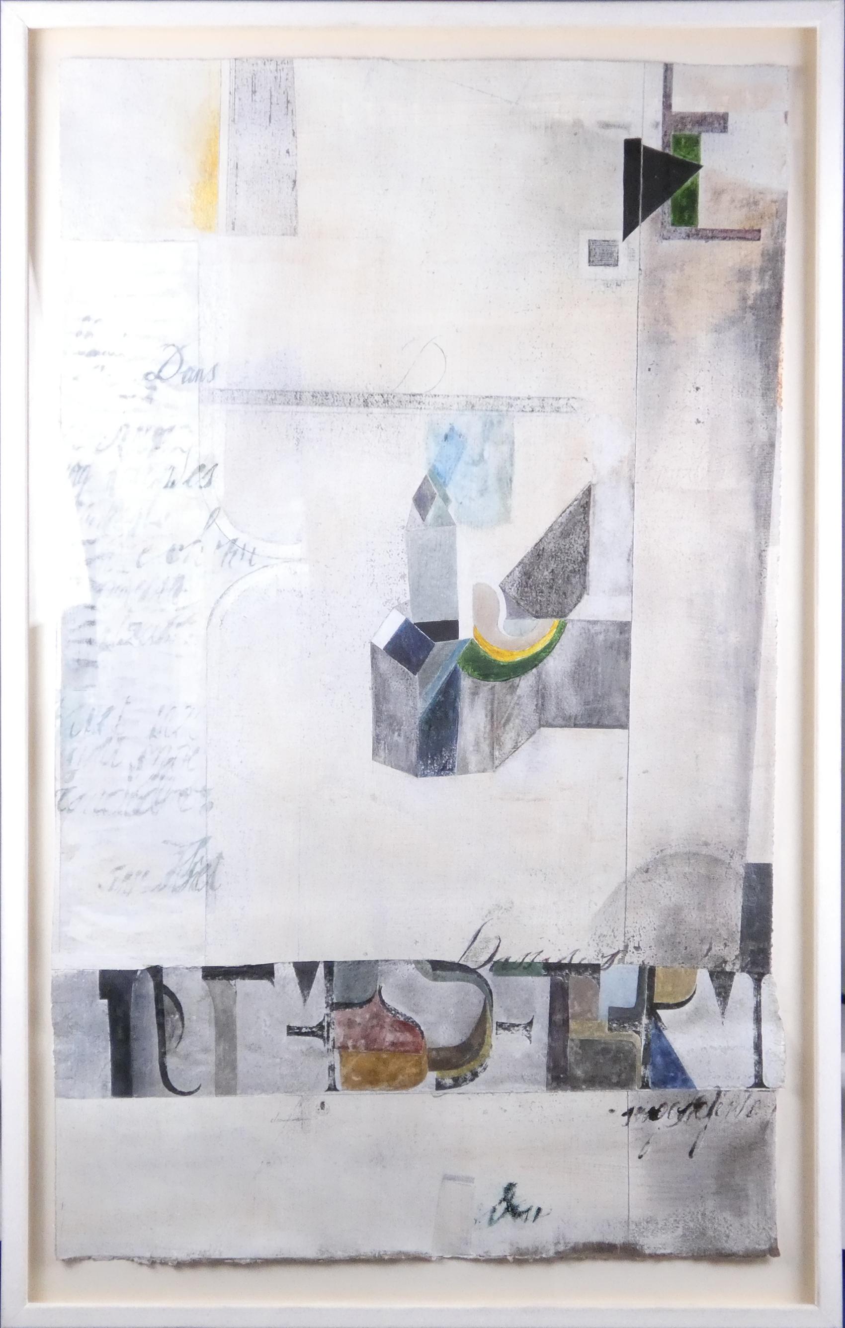 Tableau Technique mixte titré et daté au dos -Composition- 1986 signé et cachet *CLEEREMANS R.* (Raphaël) (1933, ) 103x63cm cadre blanc sous verre