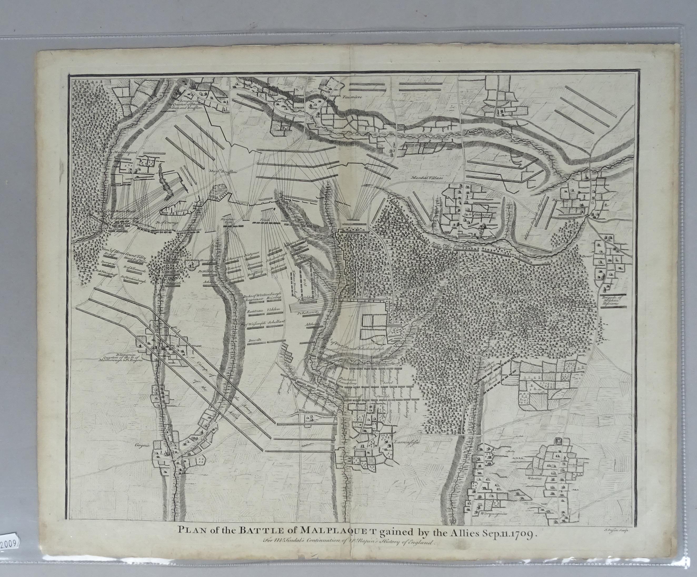 Estampe: 2 gravures sur cuivre -Bataille de Malplaquet- 39x49cm et -Valenciennes- 39x49cm 1709 TINDAL