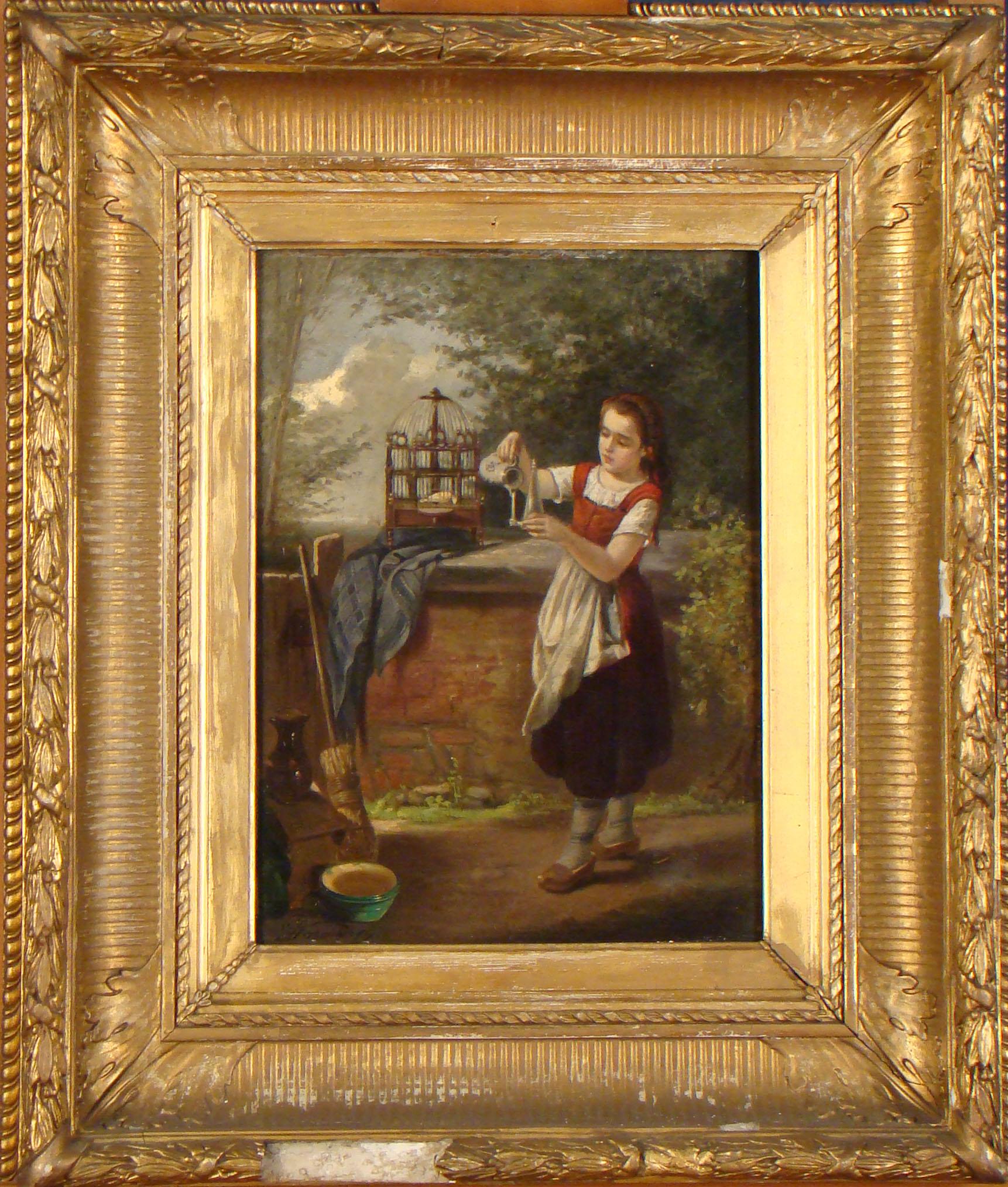 Tableau HSB -Jeune fille abreuvant les oiseaux- signé *VARENBERGH J.* (Jean) (19eS.) 35x25 cadre de style doré (acc)