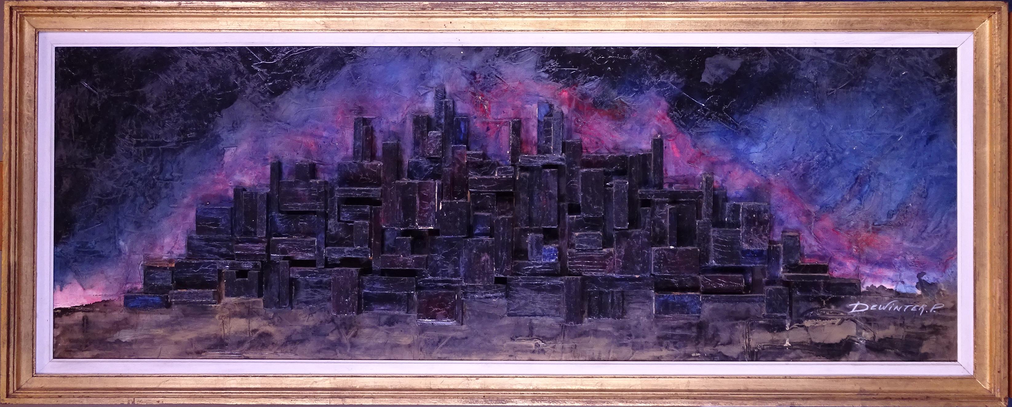 Tableau Relief -Ville de Manhattan- 1967 signé *DE WINTER P.* (Pierre) (Forest, 1935) 42x120cm cadre doré