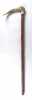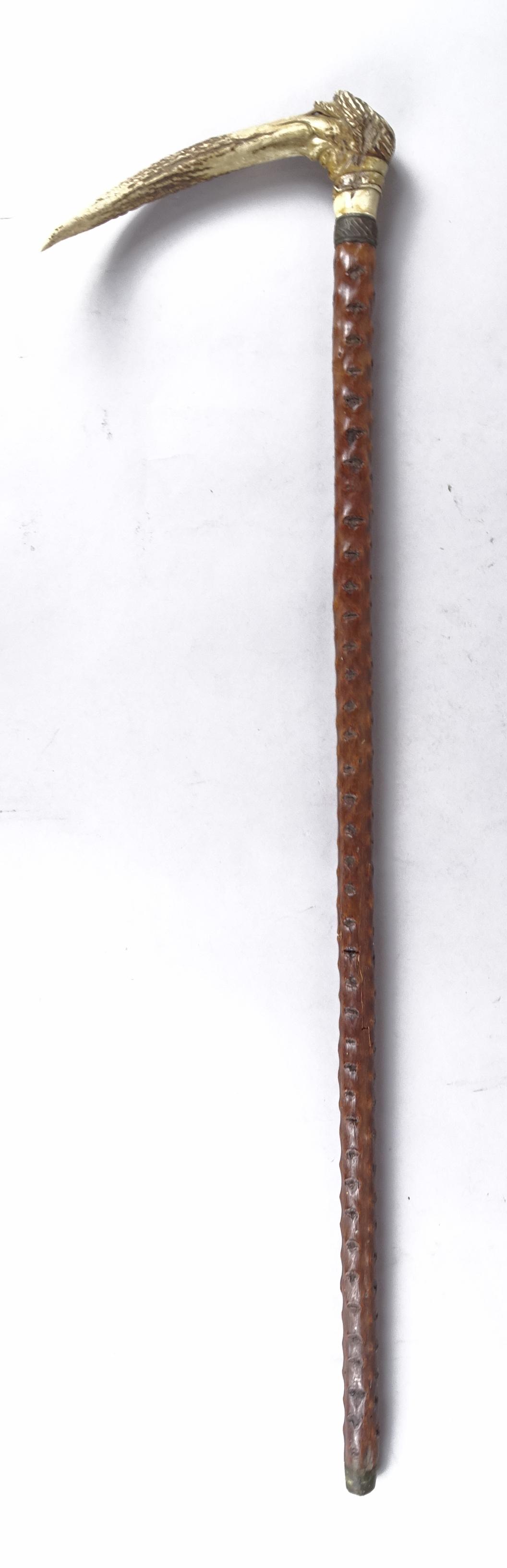 Objet: Canne a/ poignée courbe en bois de cerf sculptée d'un personnage aux yeux