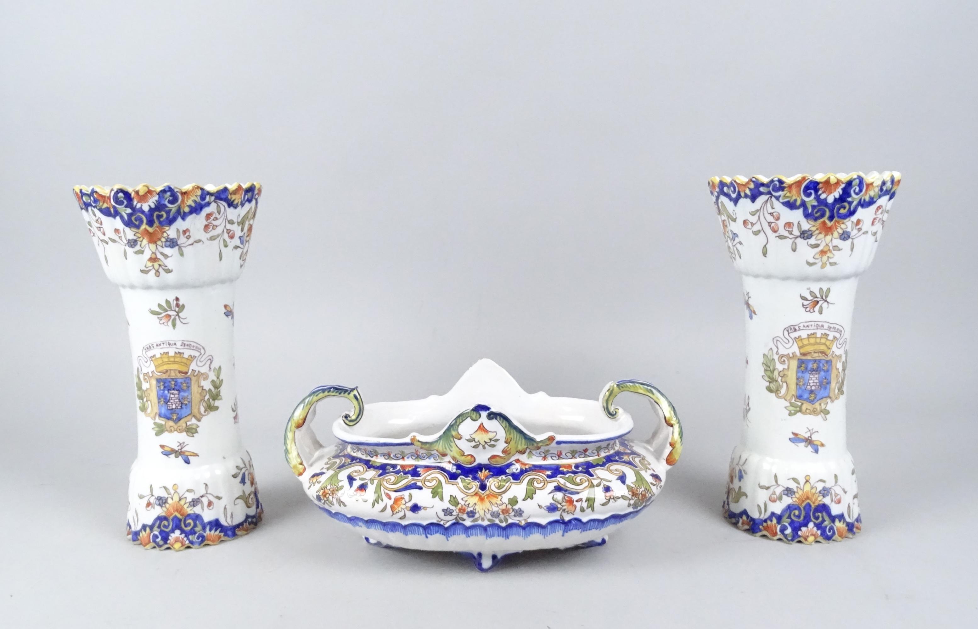 Céramique: garniture de cheminée (egr): jardinière et vases (3pcs) Vieux Rouen c