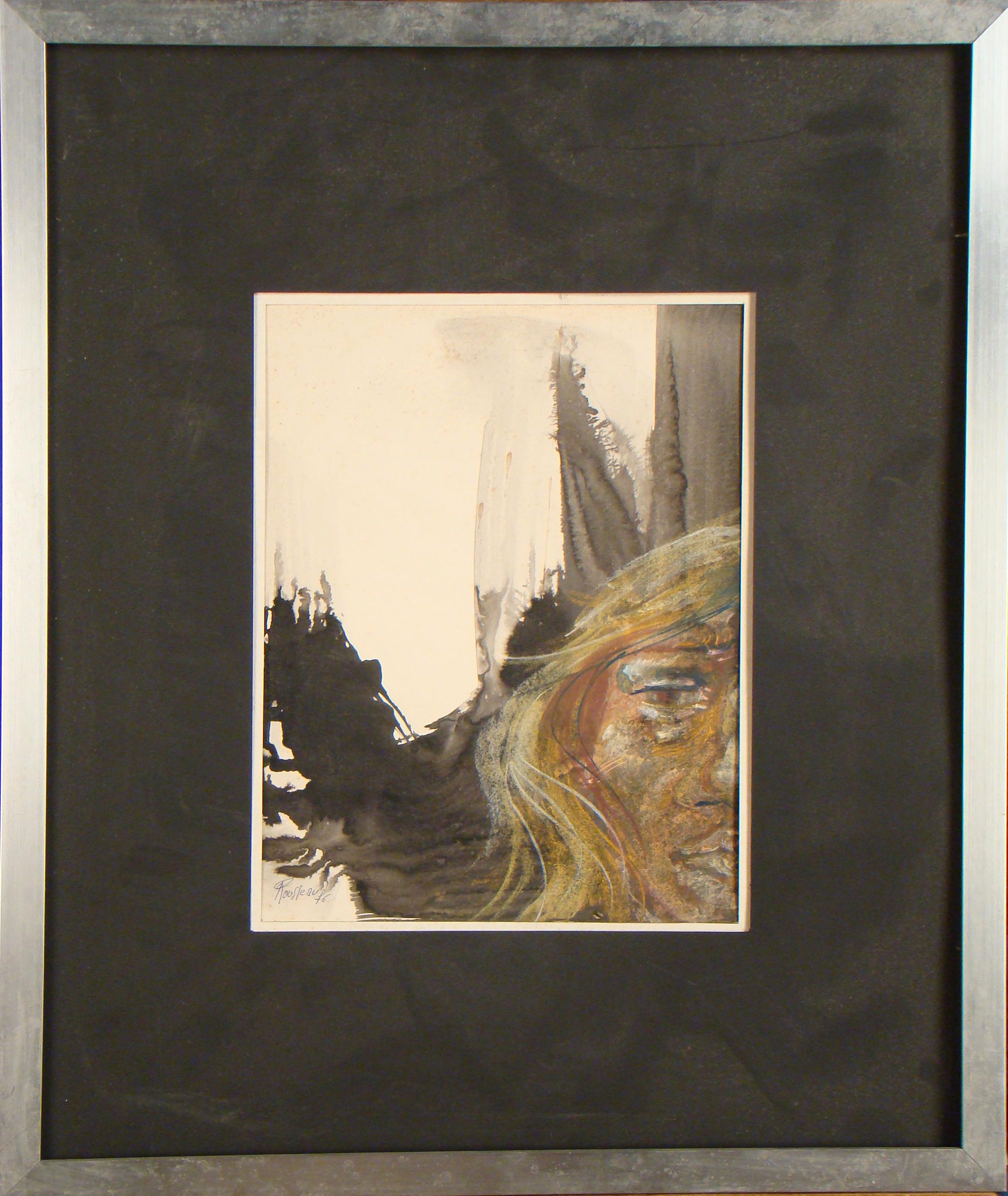 Lavis sur papier -Composition a/ 1/2 portrait- daté 1976 signé *ROUSSEAU A.* (Alain) (1945, ) 32x26cm cadre alu