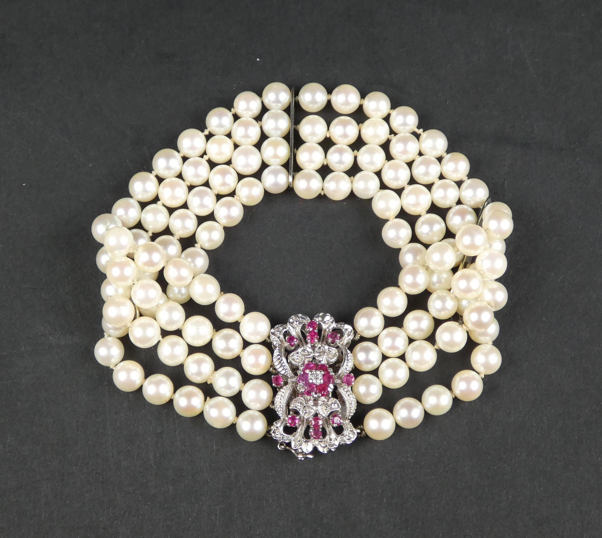 Bijou: Bracelet de 4 rangs de perles de culture avec fermoir en or blanc 18K serti de rubis Pbrut: 39,5g L: 20cm