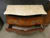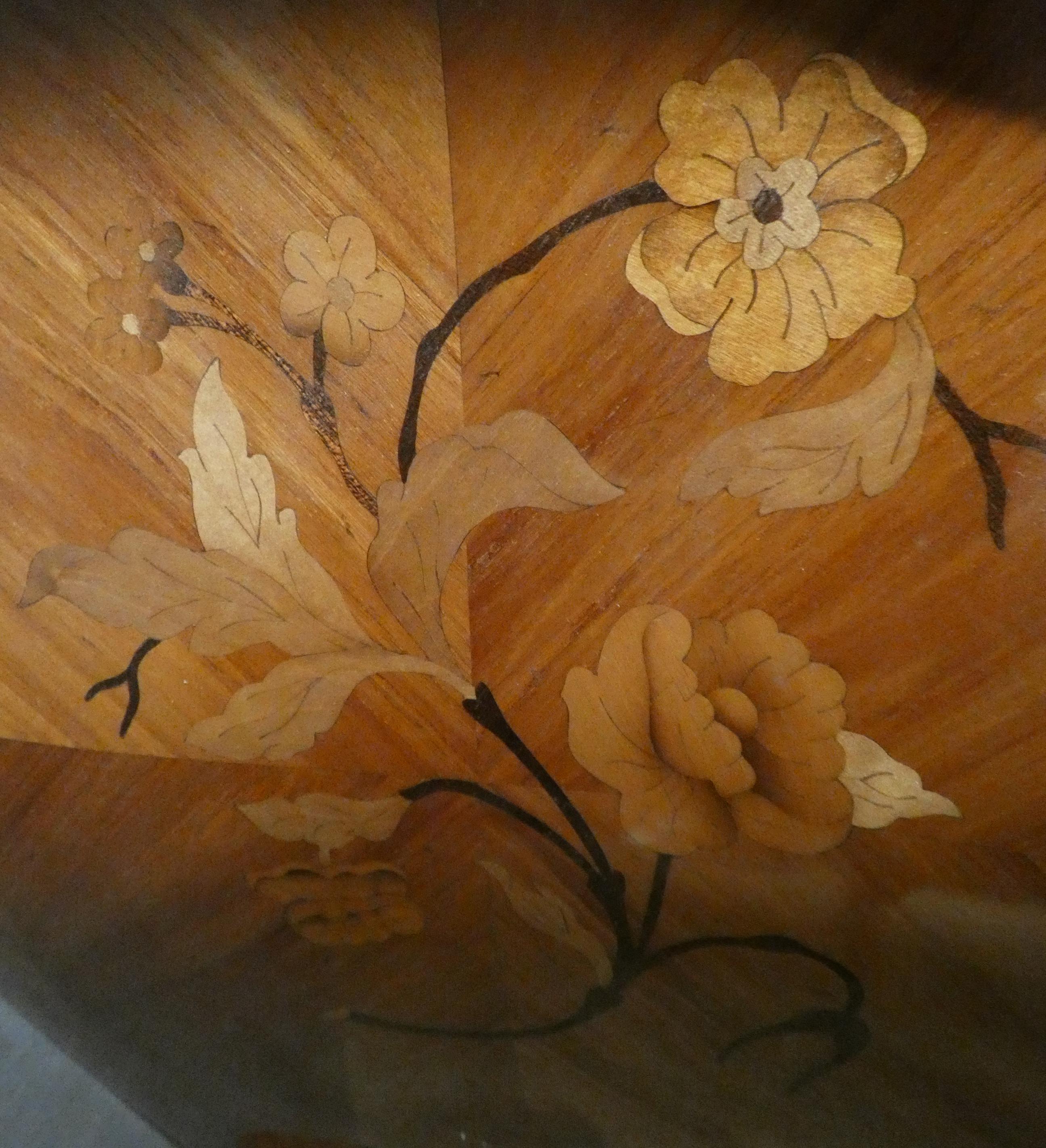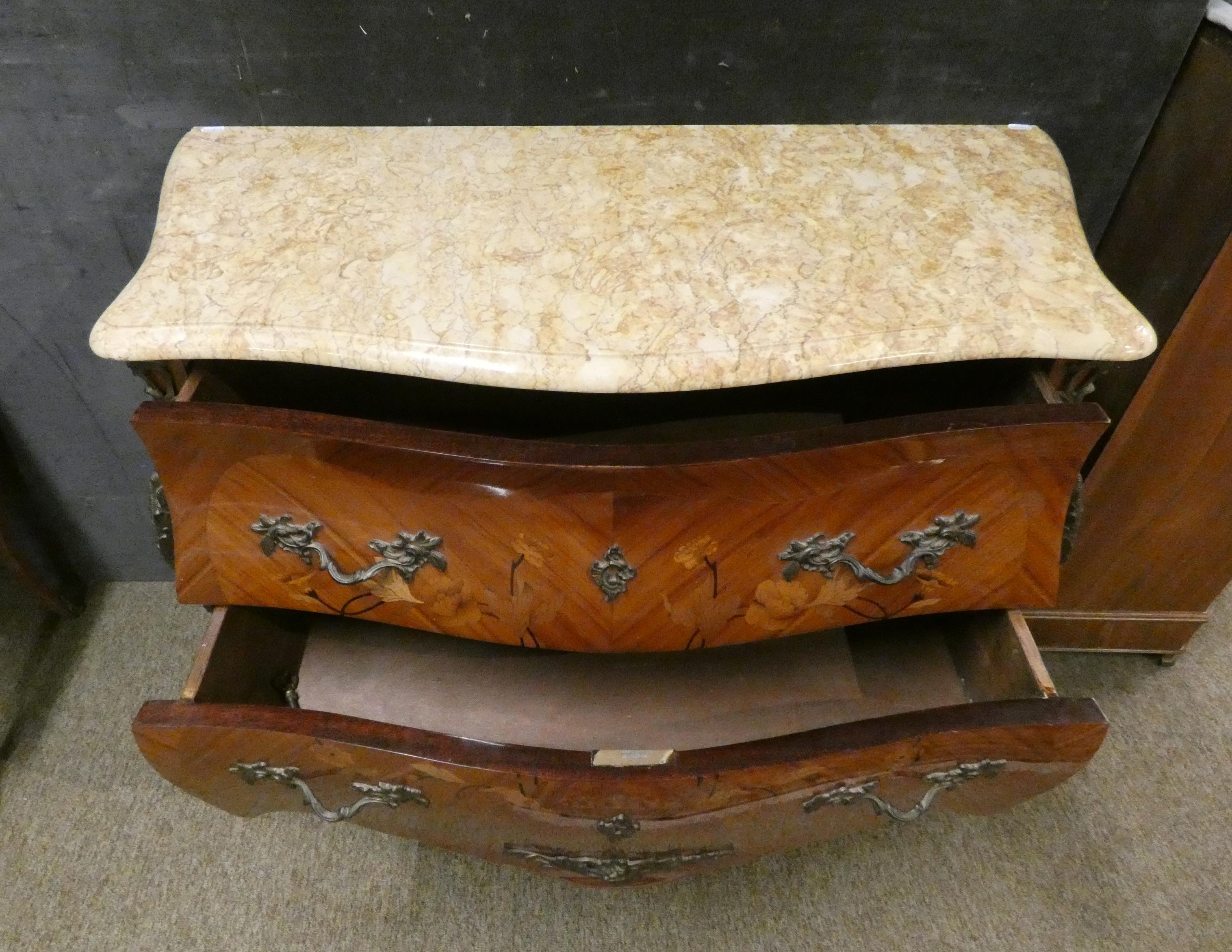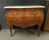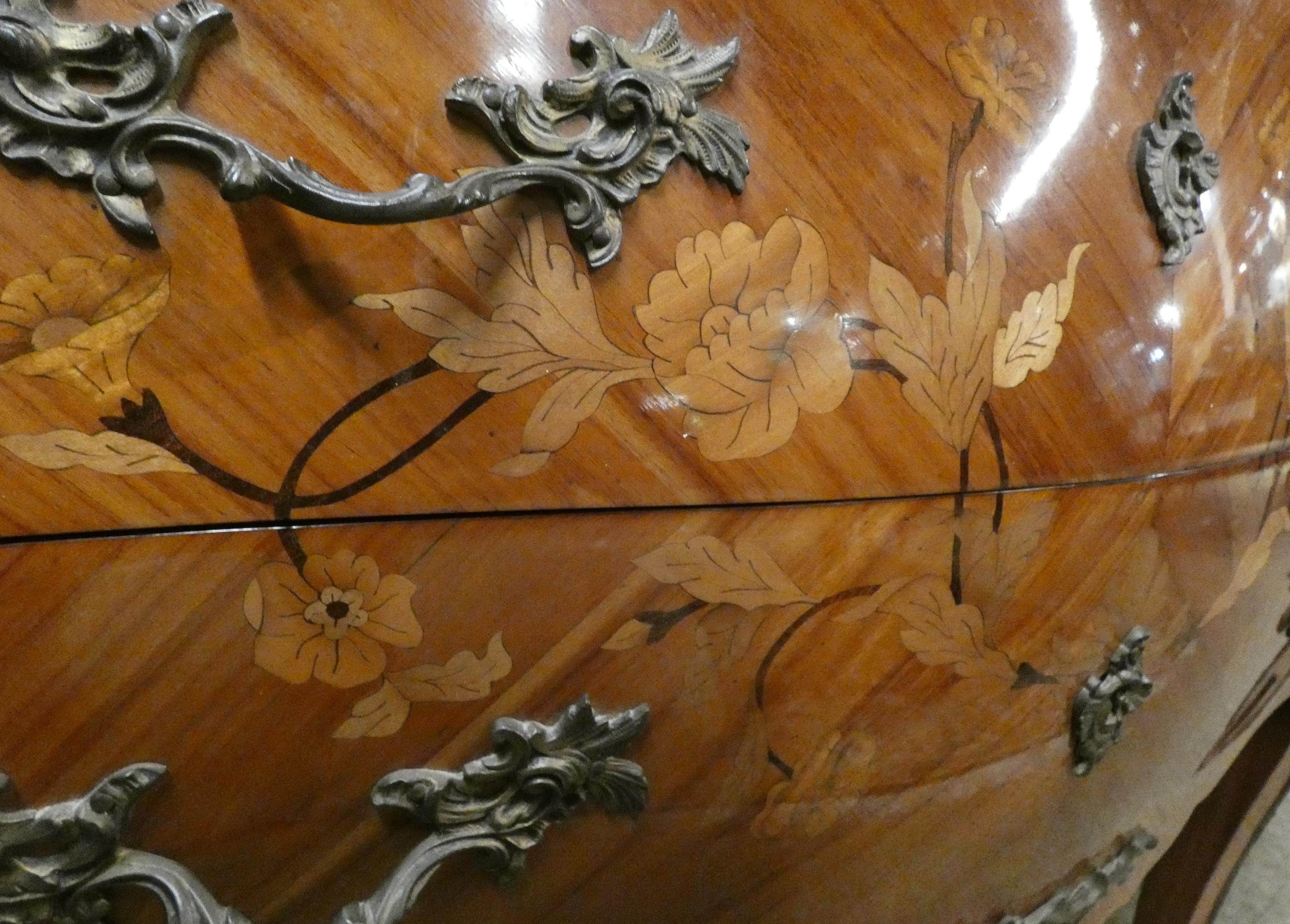 Meuble: Commode galbée de style Louis XV en placage de bois de rose estampillé CL 20eS 2 tiroirs décor de marqueterie -fleurs- 82x99x43cm