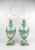 Luminaire: Paire de lampes à pétrole en porcelaine et bronze (1 boule acc) décor peint d'une scène antique avec un fond or H:78cm