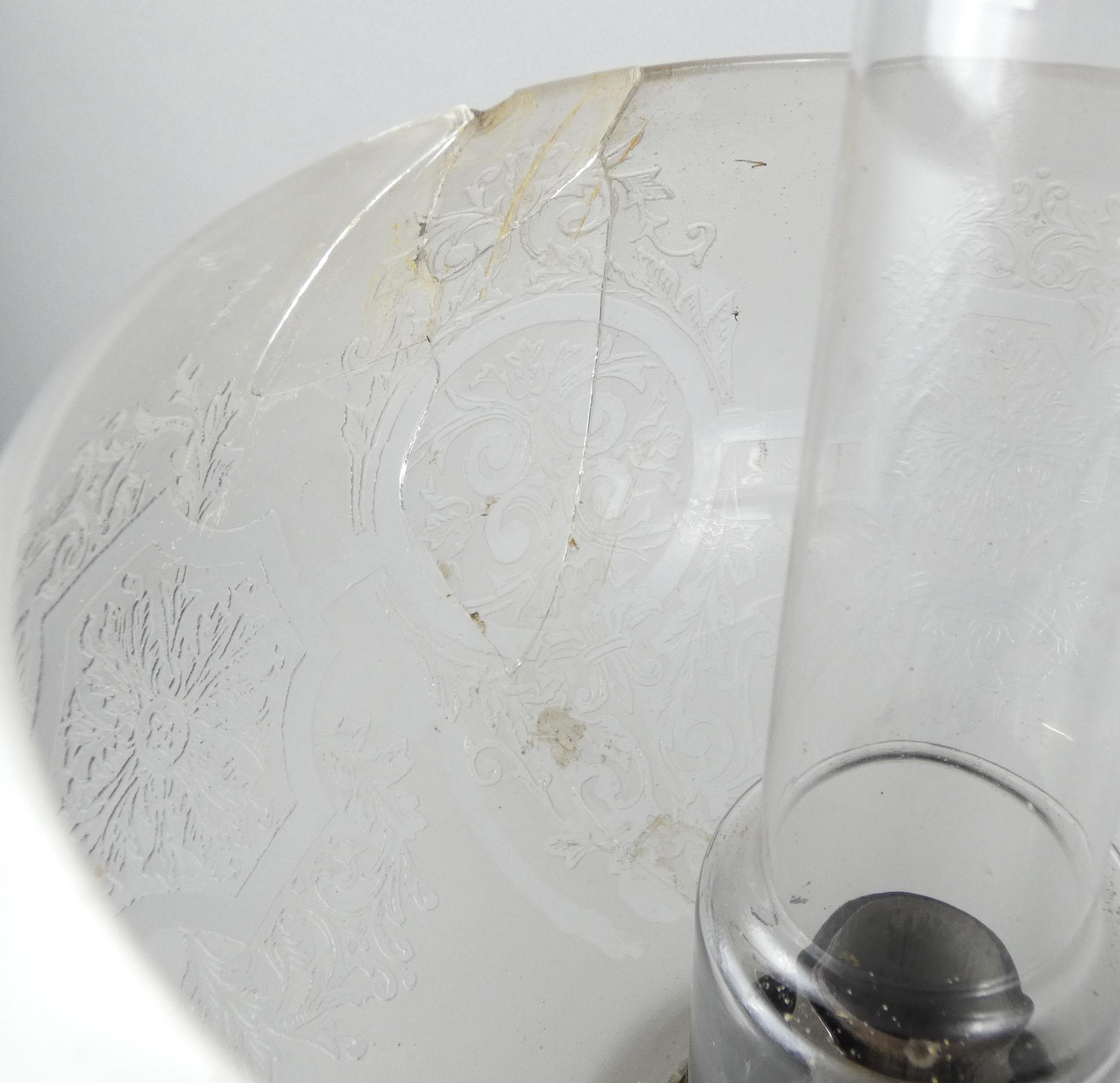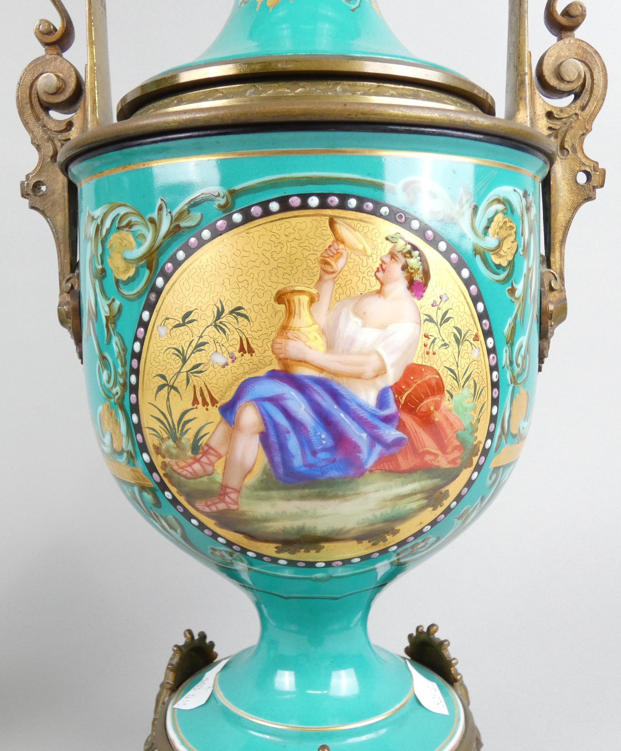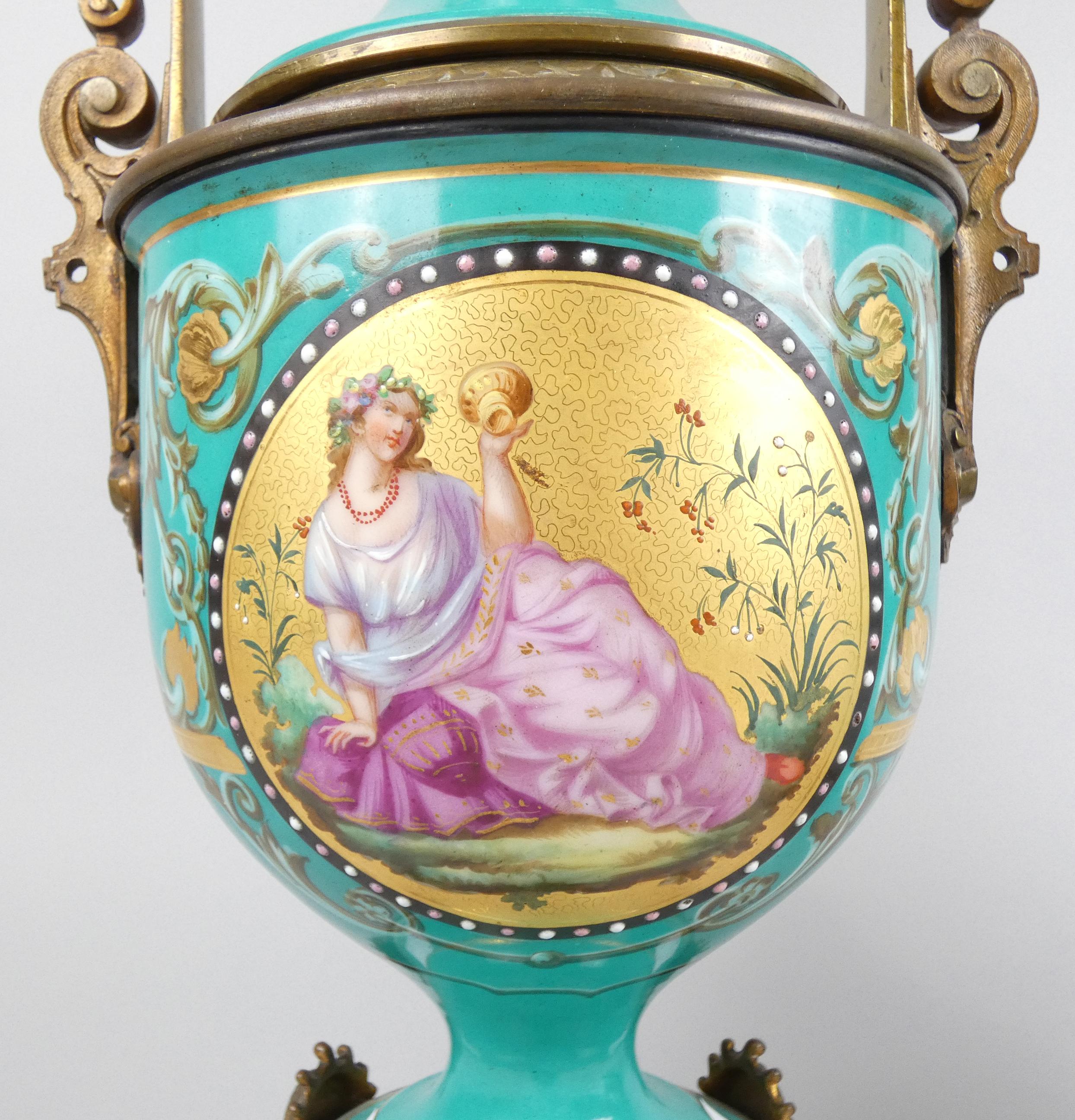 Luminaire : Paire de lampes à pétrole en porcelaine et bronze (1 boule acc) décor peint d'une scène antique