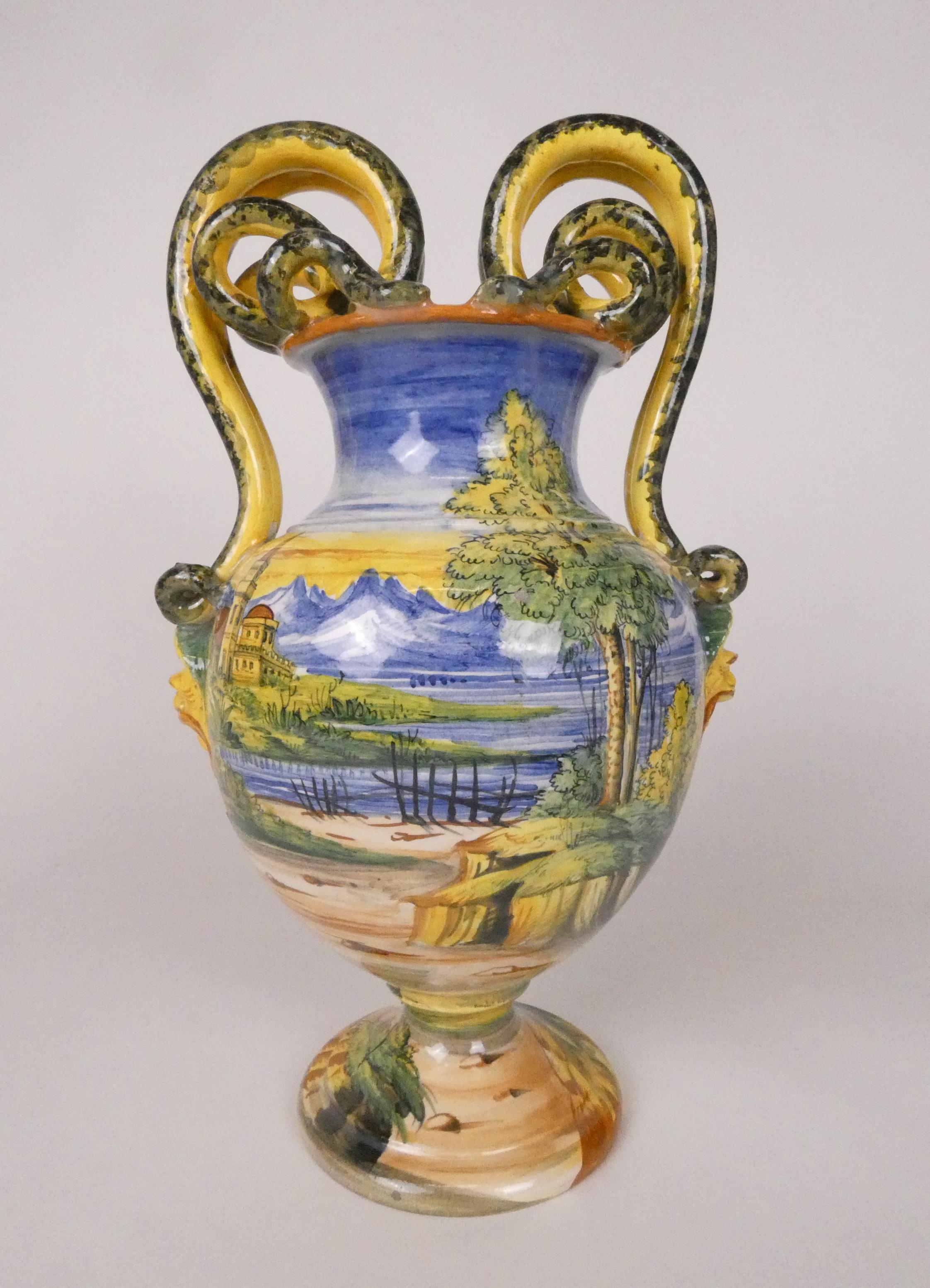 Céramique: Vase en faïence (egr) dans le goût de URBINO anses de serpents décor peint d'une scène antique H:38cm