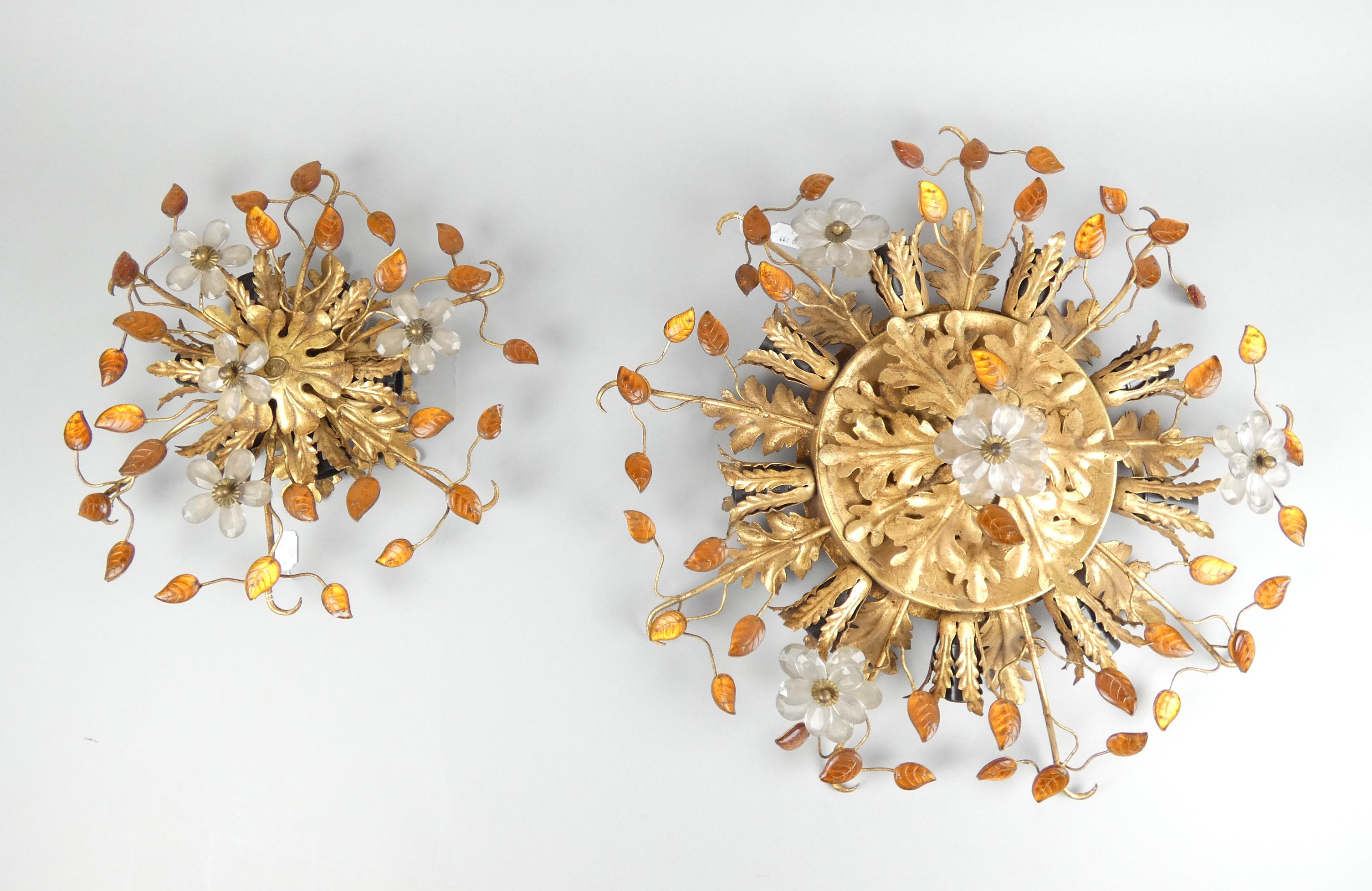 Luminaire: Plafonniers (2pcs) attribués à la maison Baguès en métal doré et verroteries -fleurs- Diam+/-:40cm 6 lumières et 55cm 9 lumières