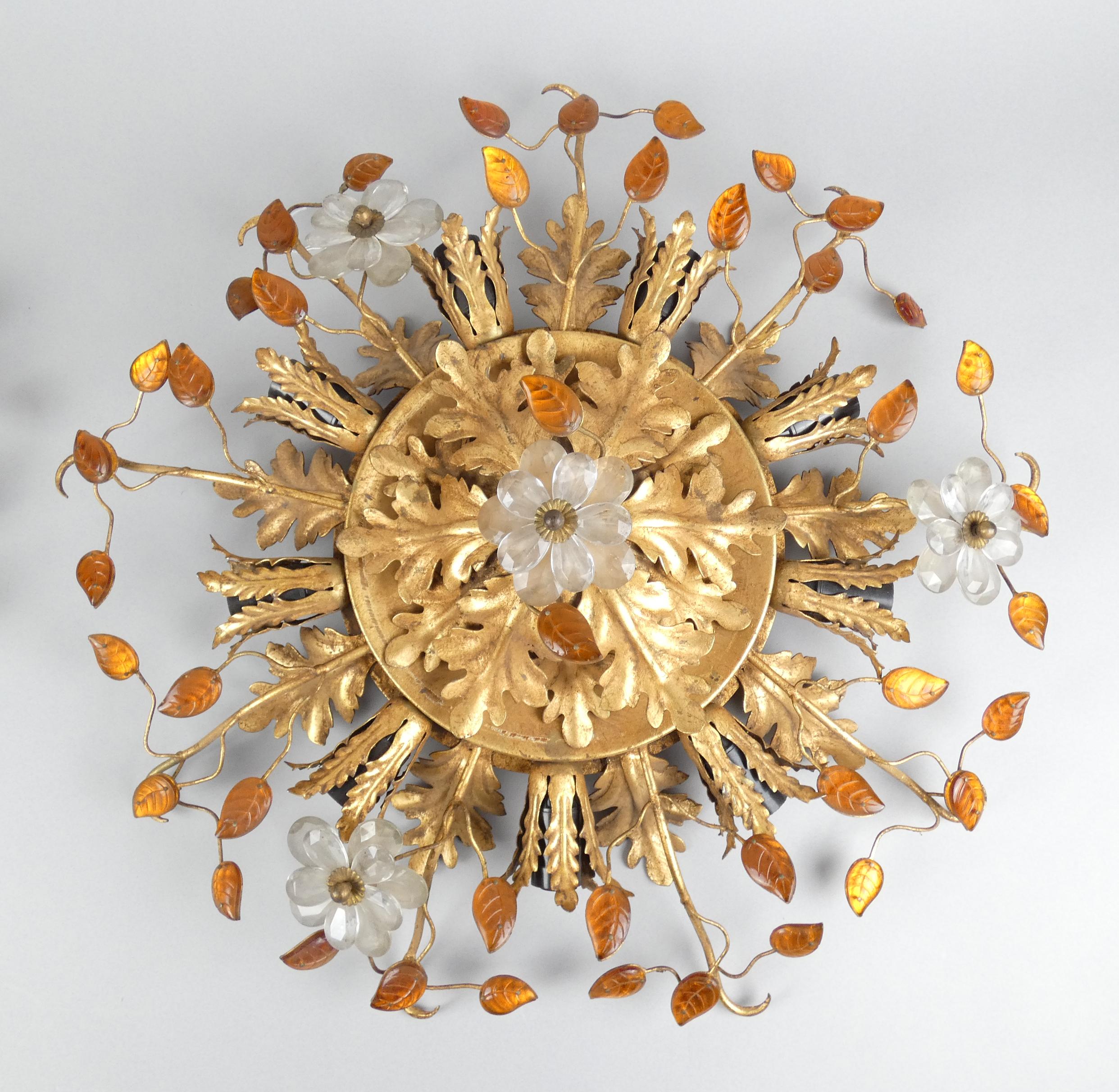 Luminaire : Plafonniers (2pcs) attribués à la maison Baguès en métal doré et verroteries - fleurs -