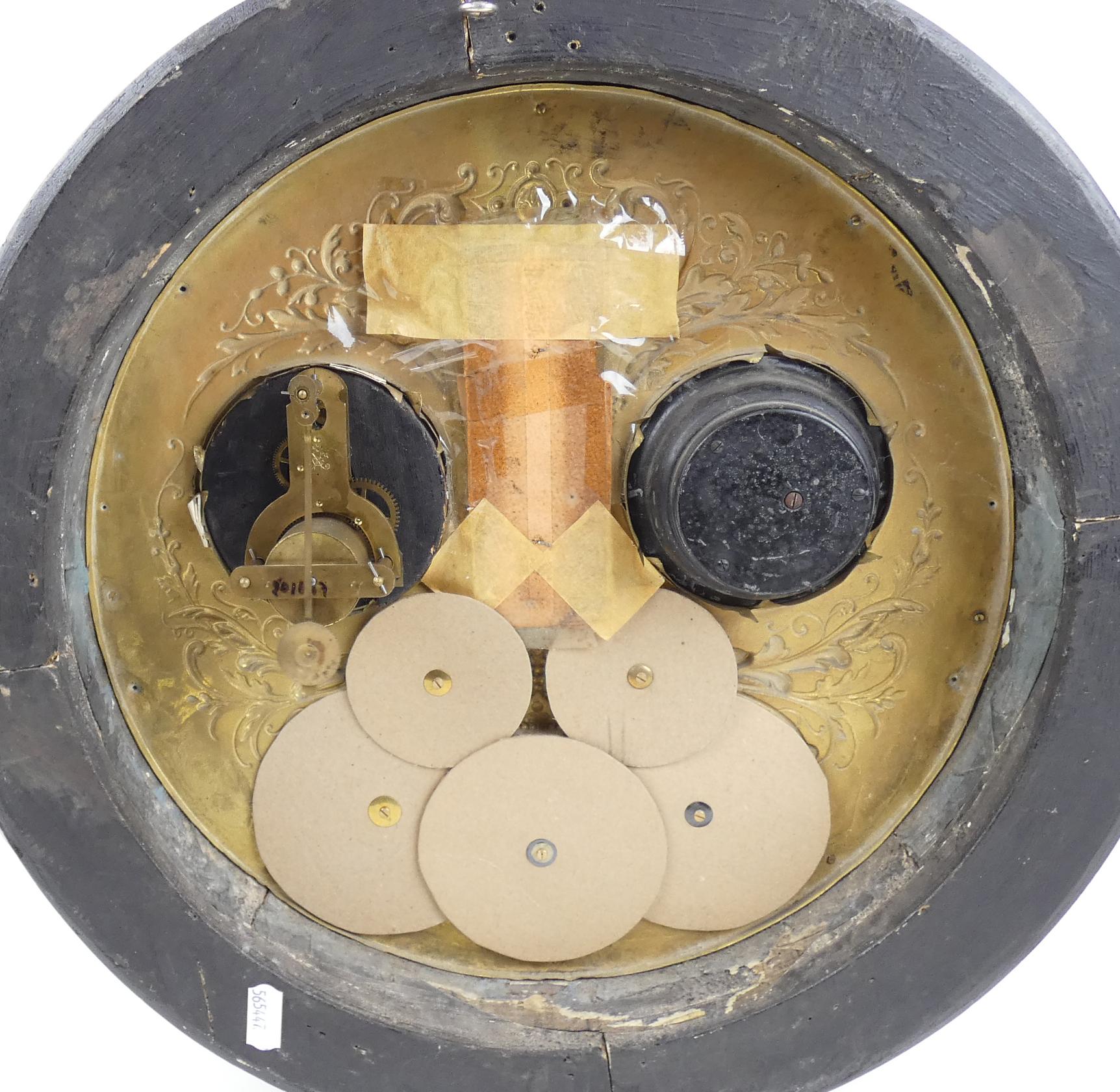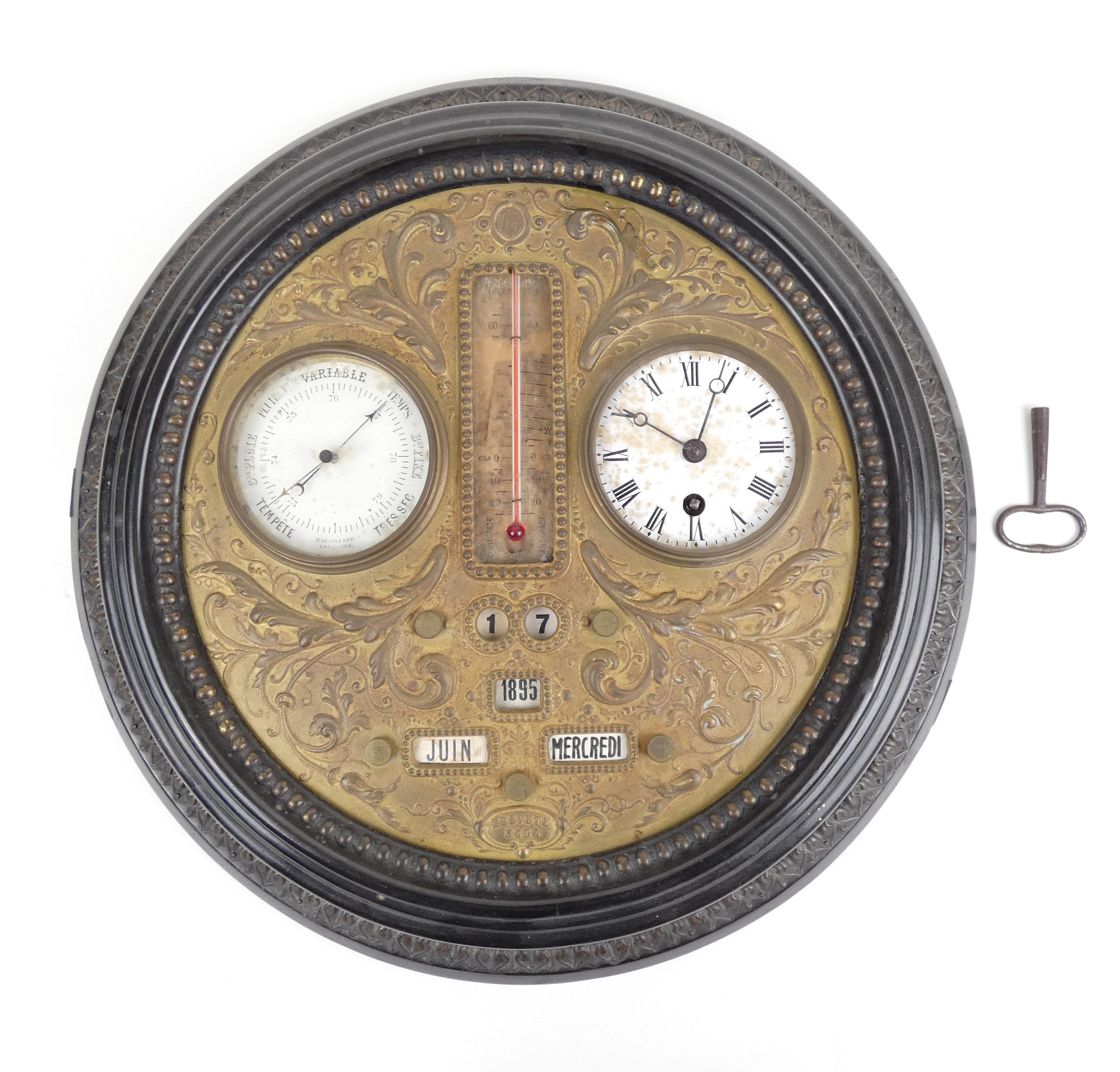 Horlogerie: Horloge murale (Ds l'état) ronde en cuivre et bois circa 1880 avec baromètre, thermomètre et calendrier signé TA breveté SGDG D: 41cm
