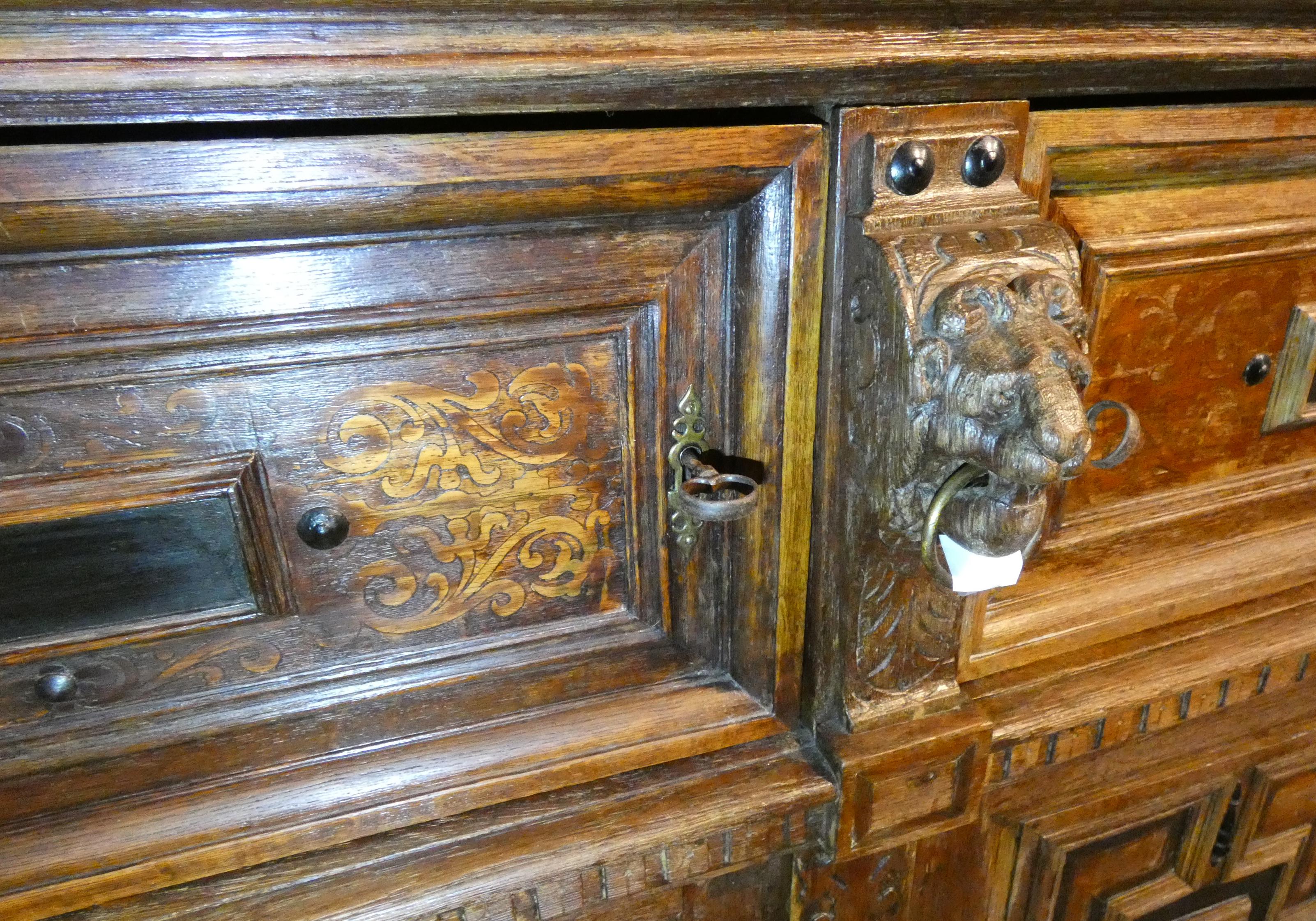 Meuble: Buffet dit -Ribbank- en chêne mouluré de réserves partiellement teintées 17eS 2 portes séparées par des têtes de lions dessous 2 portes 139x160x65cm