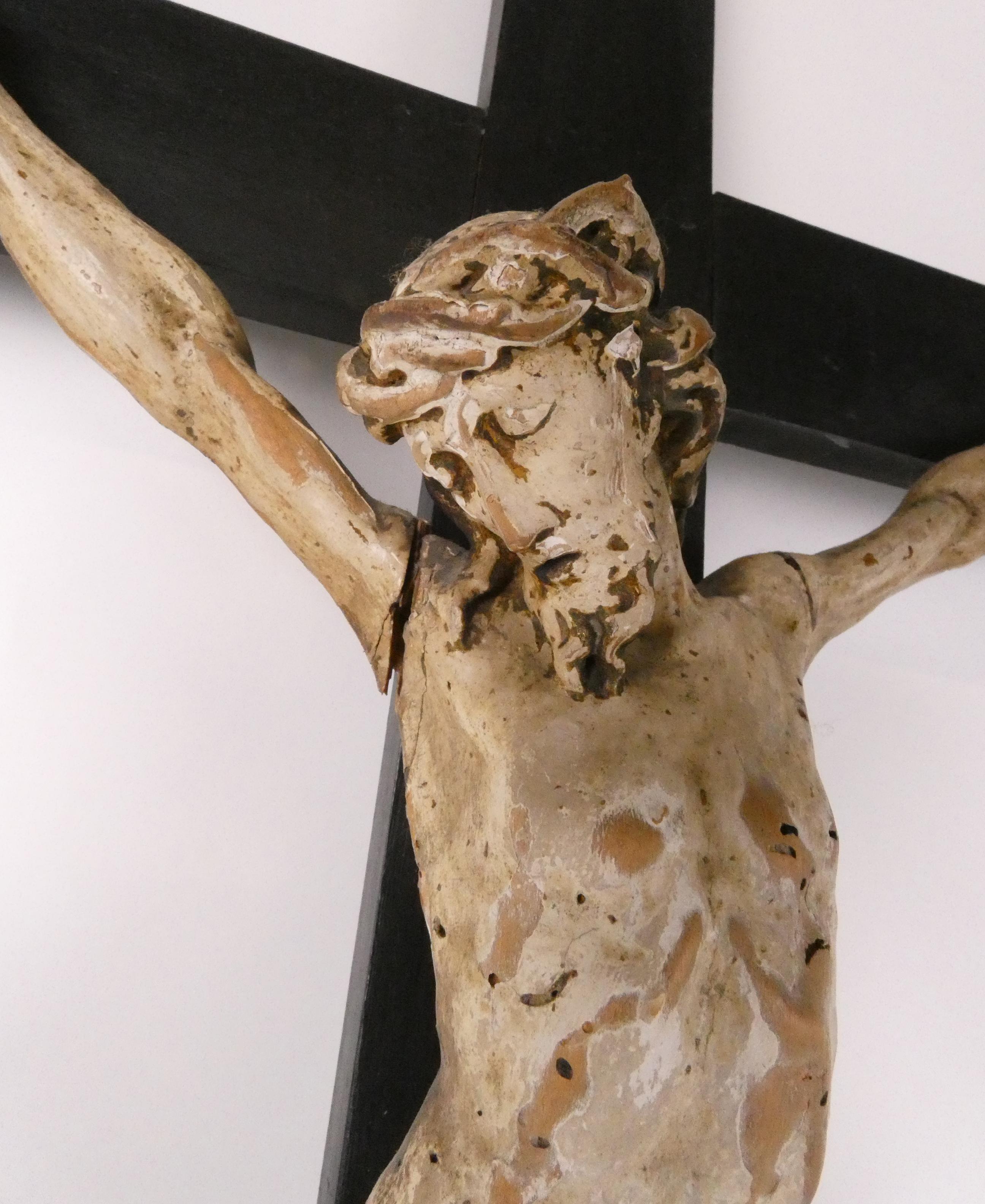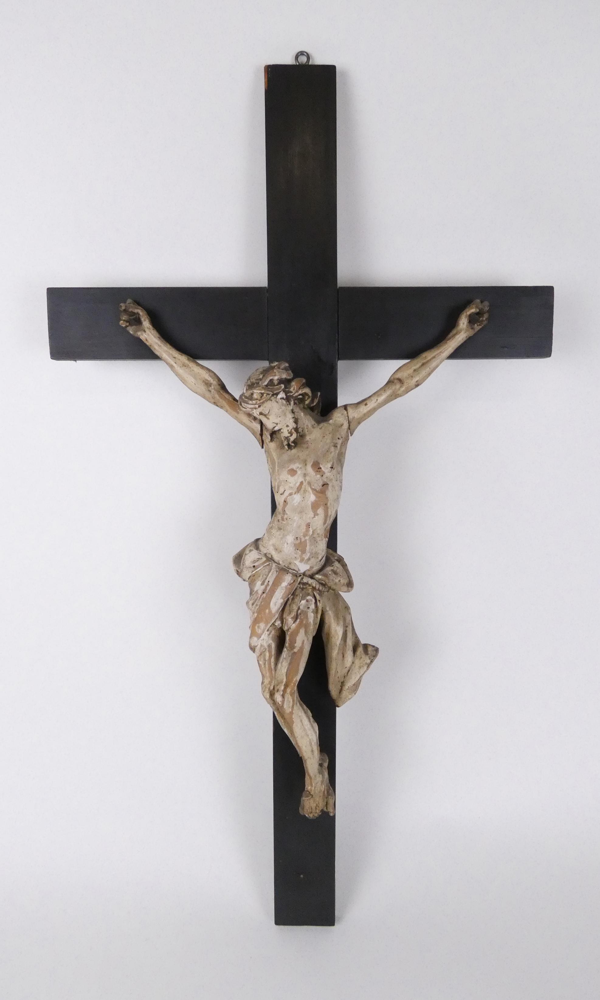Religieux: Christ en croix en bois laqué (usure, mq, acc) probable école Flamande fin 17 début 18e H:44cm avec sa croix H:75cm