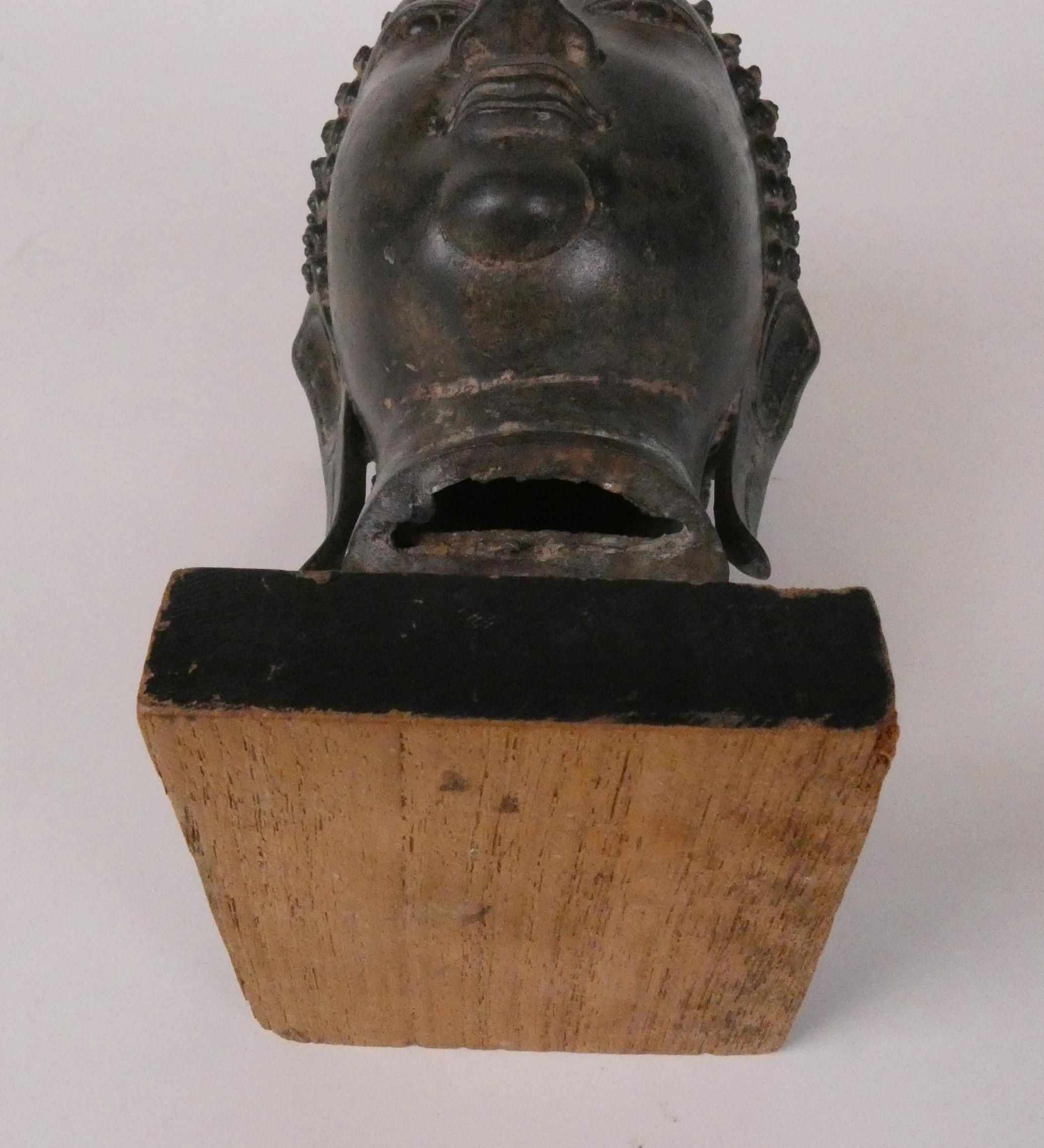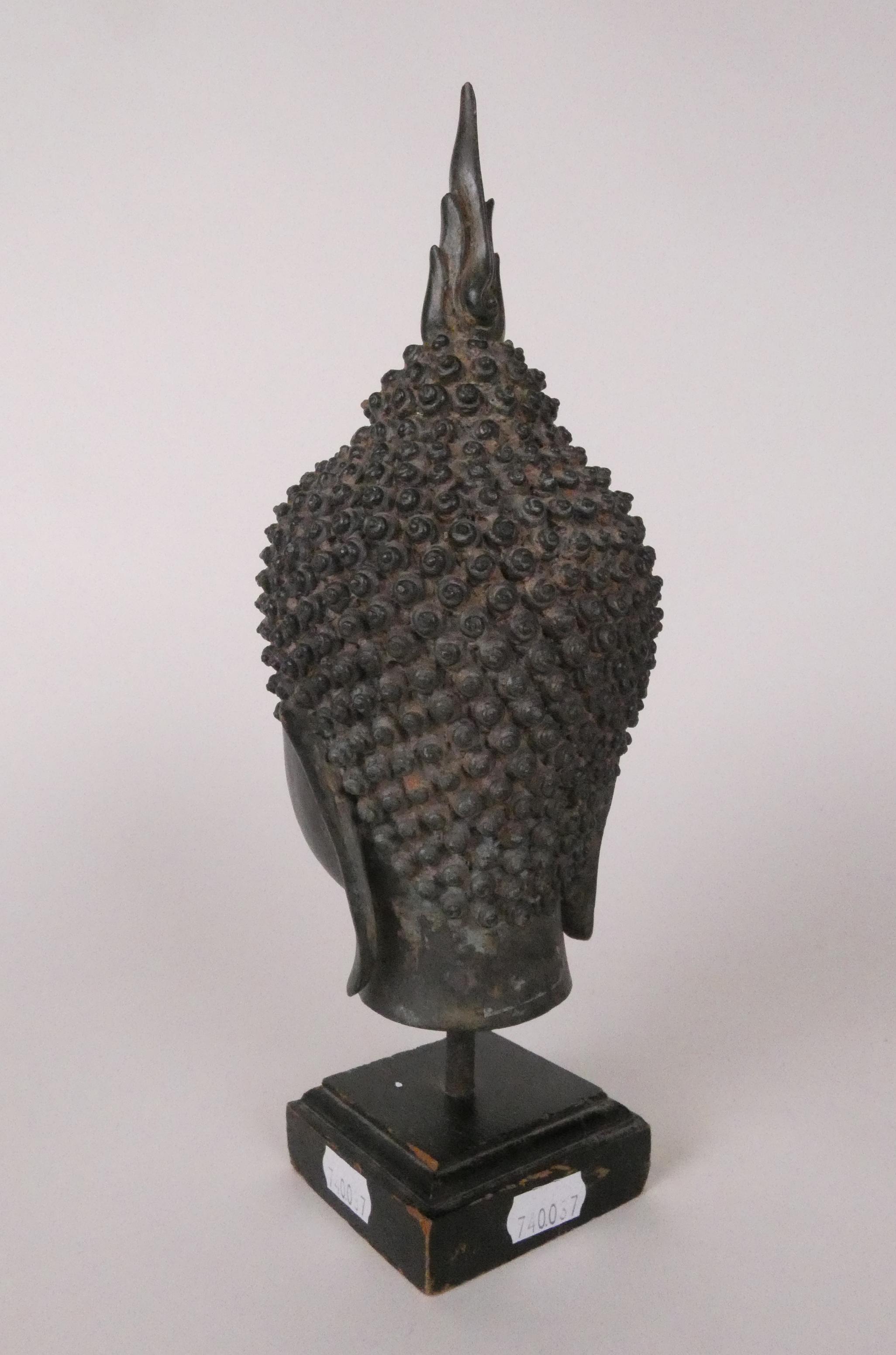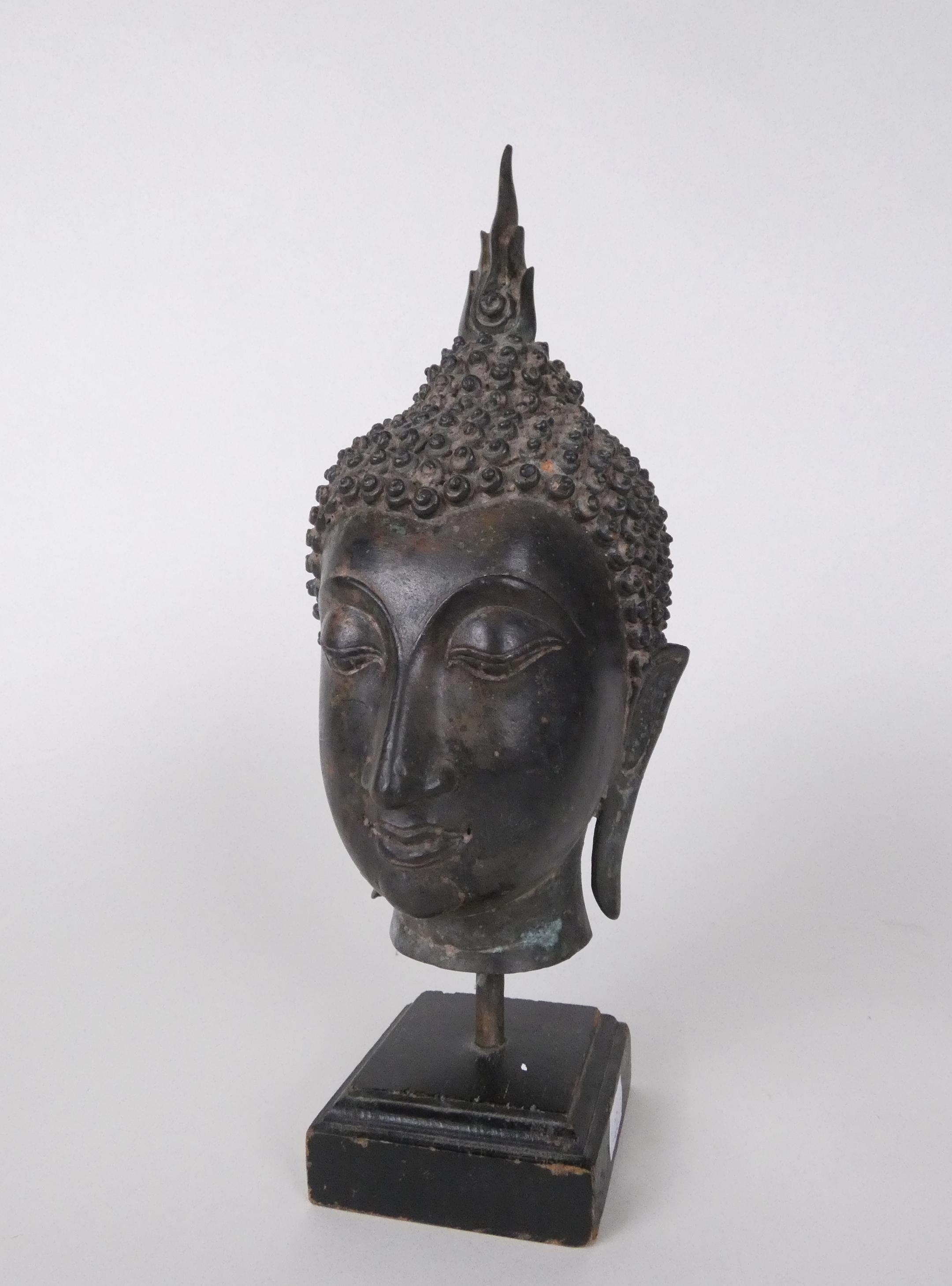Asiatique: Tête de Bouddha en bronze Tahïlande 20eS yeux mis clos, lobes étirés, surmonté d'un Rasmi H:24cm sur socle en bois
