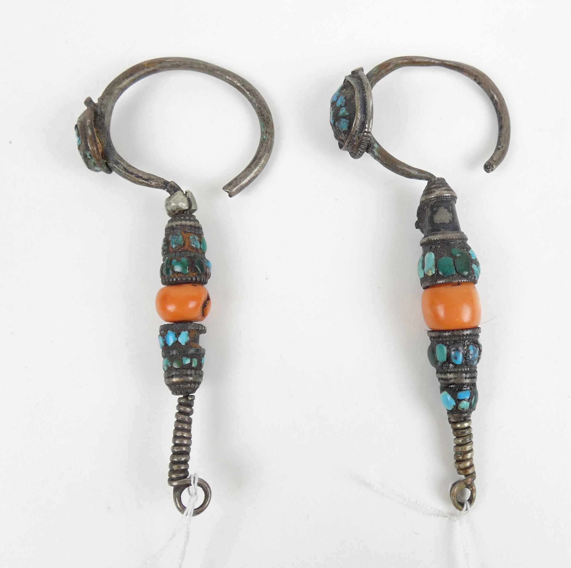 Asiatique: EU ONLY Boucles d'oreilles du Népal probable monture en argent avec turquoises et corail P:39g